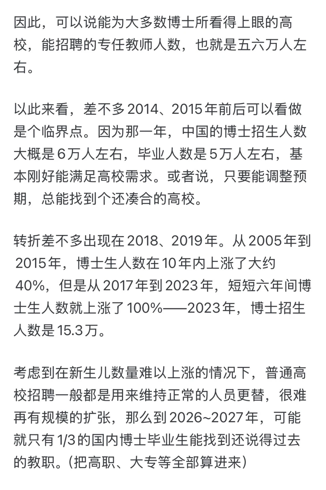 所以,正常来说,不考虑专业的冷热差异,即便全员博士(把中西部地区大量的三四线城市的本专科全算上),未来每年高校能招聘的教师人数大约也就是8~10万人。