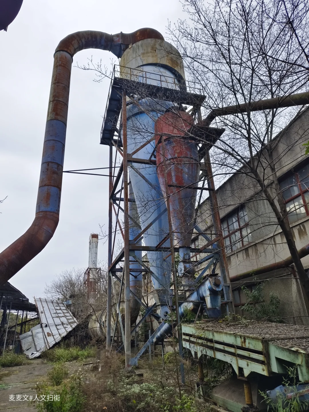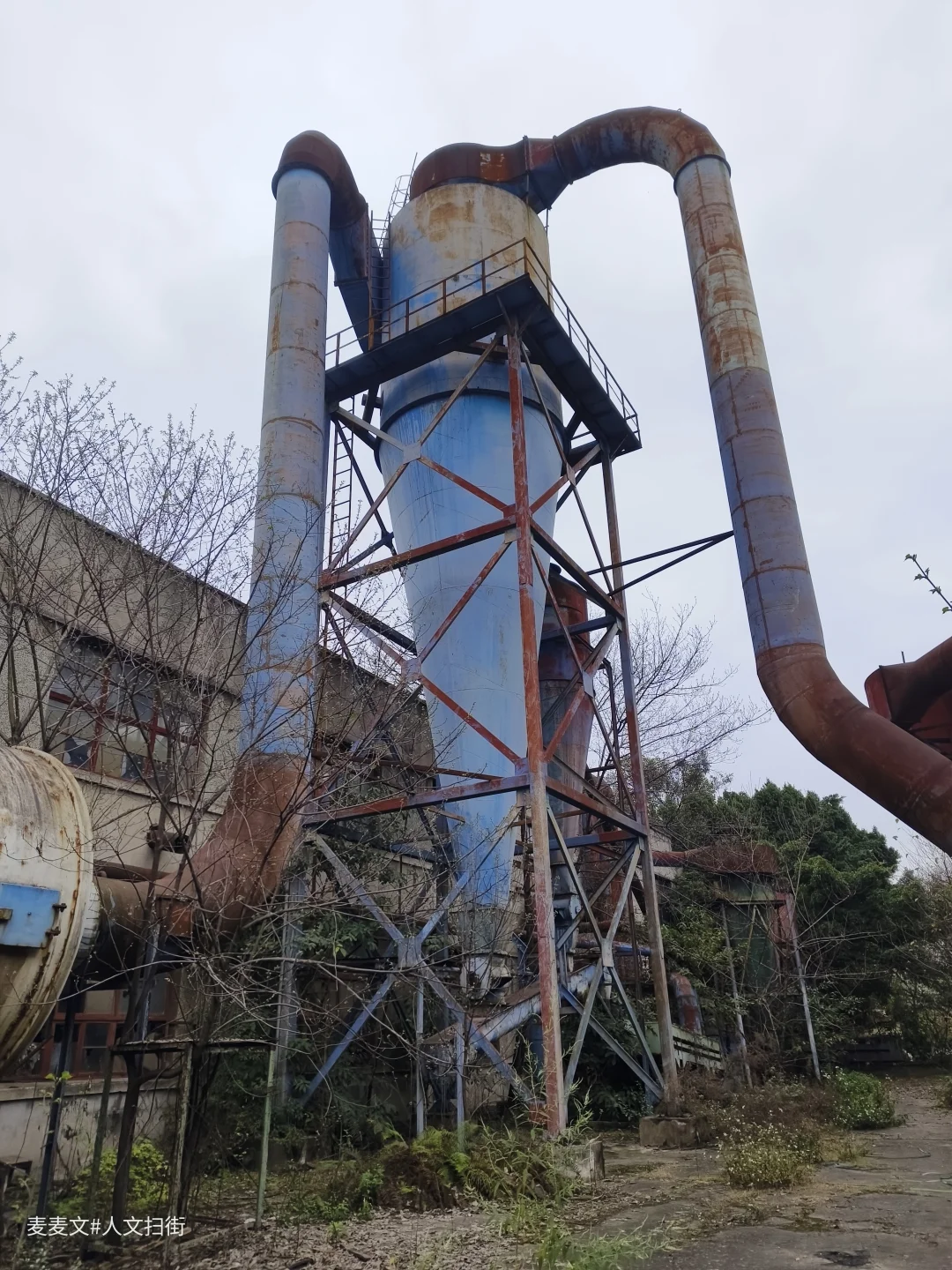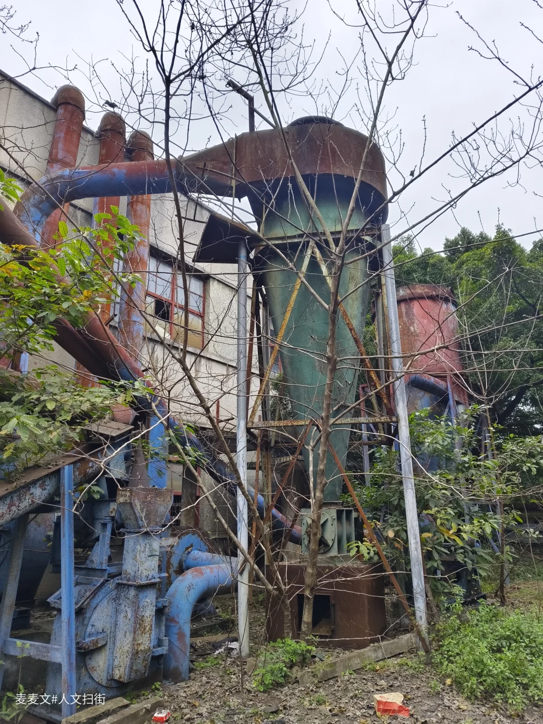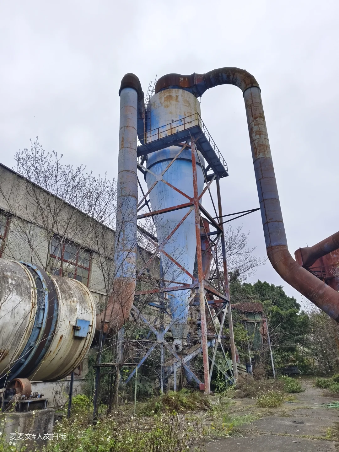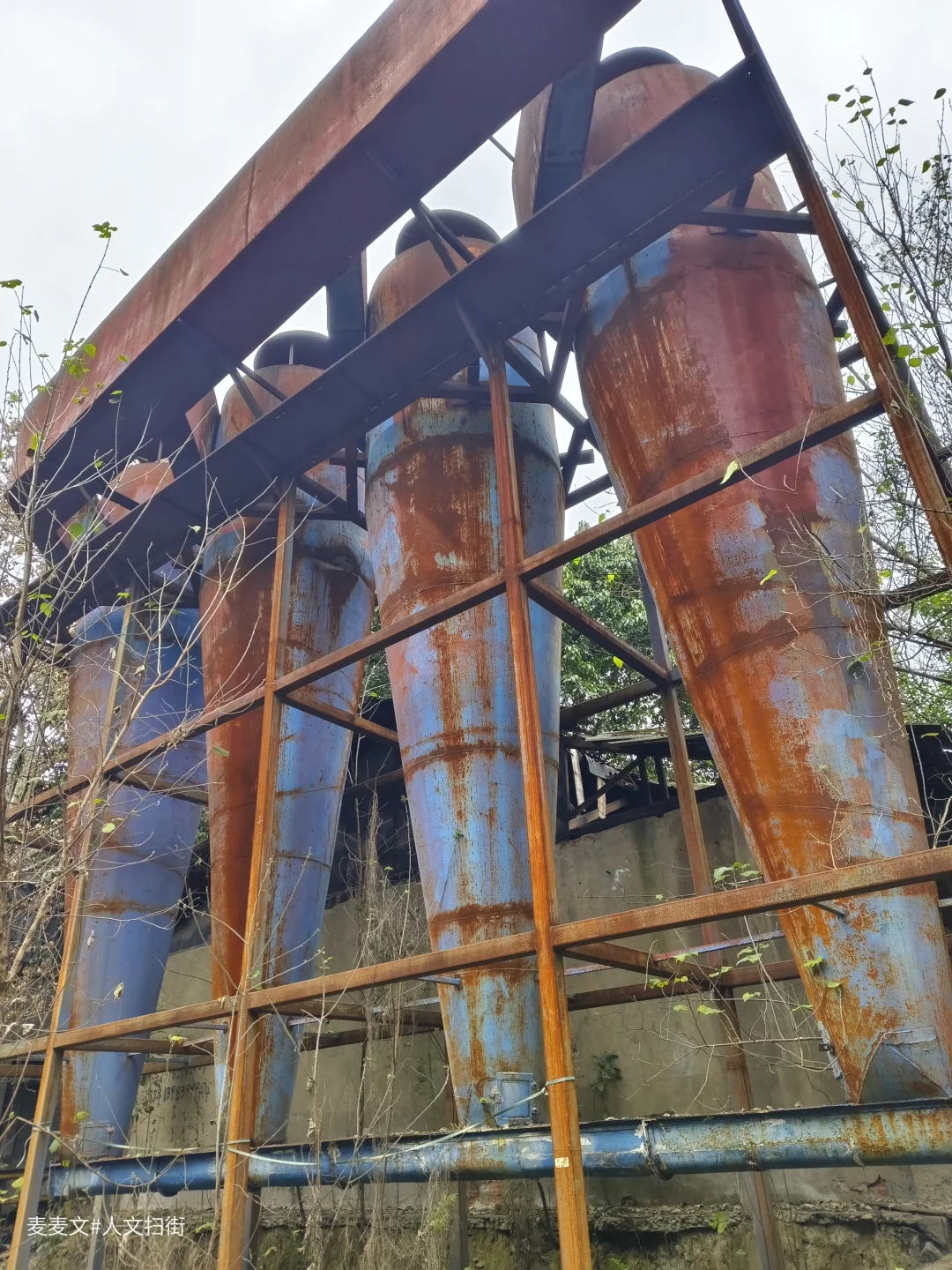 在重庆大渡口某废弃的老厂房里,蓝红交织的旋风分离器与巨型滚筒烘干机静静伫立,锈迹爬满金属骨架,像被时光遗忘的巨兽。 杂草从水泥地的裂缝里钻出,缠绕着生锈的管道与螺旋输送机,把工业的硬朗揉进自然的柔软里。厂房内,破碎的砖瓦与散落的零件诉说着曾经的轰鸣,而室外,灰蒙的天空下,管道迷宫与锥形罐体构成了超现实的工业图景。 这里曾是重庆工业的脉搏,如今,每一道锈痕都在低语:钢铁时代的余温,仍在这座城市的肌理里流淌。