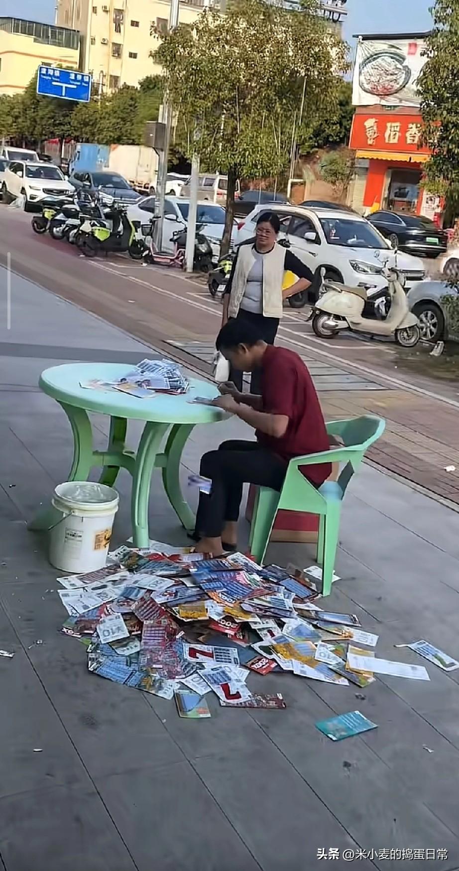大叔都刮破产啦,还不死心! 刮刮乐刮到满地废票,网友:投降输一半吧 惠州街头撞见的一幕,看得人心里五味杂陈。 大叔坐在塑料凳上,脚边堆着小山似的刮刮乐废票,手里还在专注地刮着新票,身后的大姐叉着腰,眼神里满是无奈。 有人调侃:“大叔,别刮了,都刮破产了,投降输一半哦!”可大叔头也不抬,仿佛下一张就能中大奖。 我们总笑买彩票是交“智商税”,却忘了这几块钱,是普通人最廉价的美梦。不用拼学历,不用看背景,刮开涂层的那几秒,谁都能拥有翻身的期待。 可现实是,千万分之一的希望,终究抵不过柴米油盐的账单。 你有过刮彩票上头的时刻吗?