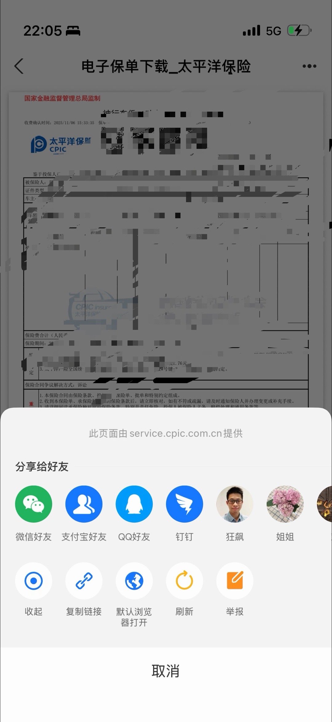 然后支付宝上面能查到保单(图1),点进去能看到(图2),正常这里点更多就应该可以下载吧,好的完全不能下载,分享给别人甚至打不开链接。