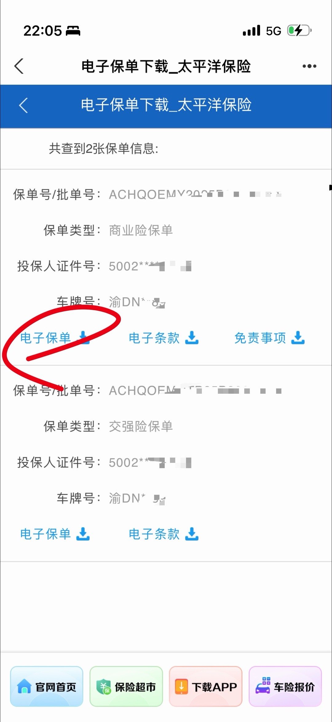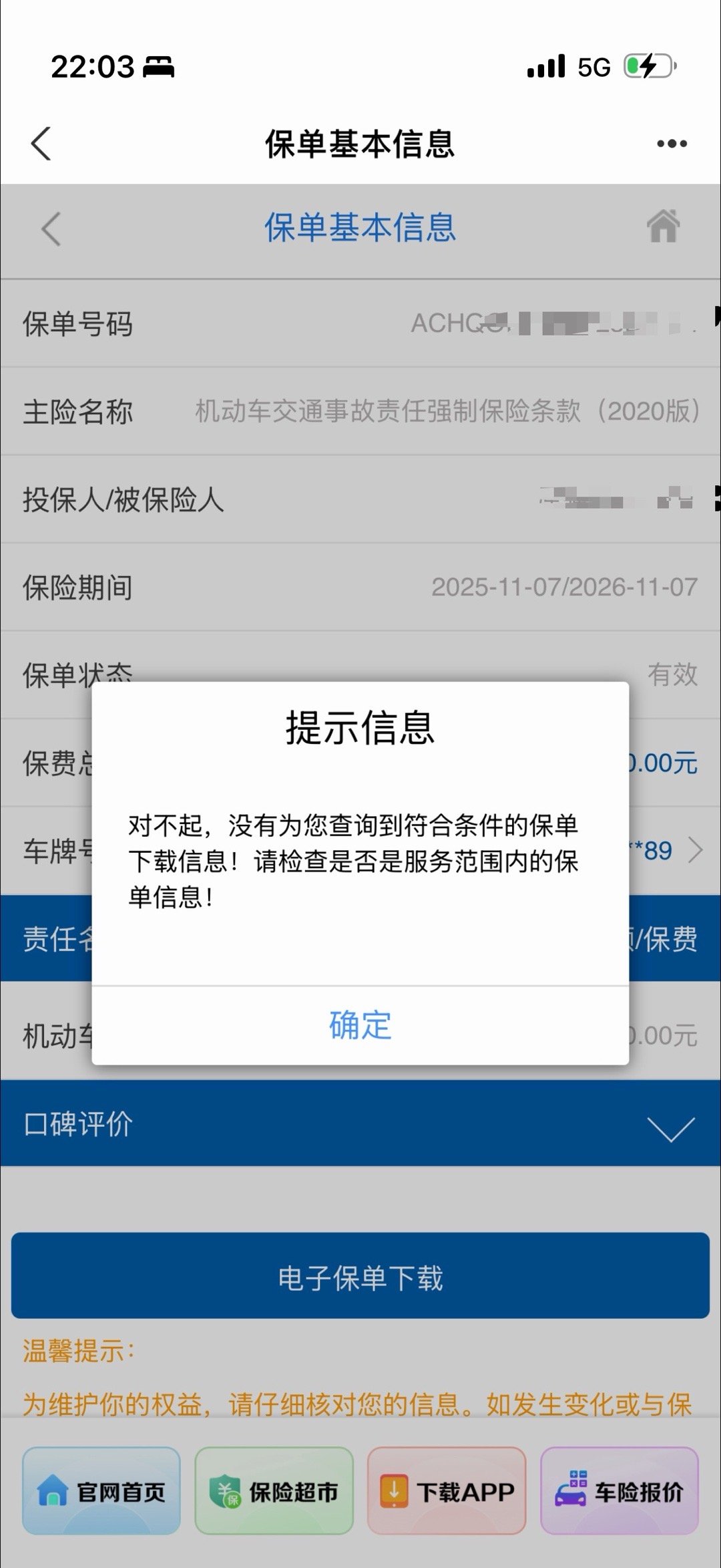 于是通过支付宝打开了太平洋财险官网,又查询到了保单(图3),点击下载,好的提示没有符合条件的下载信息。