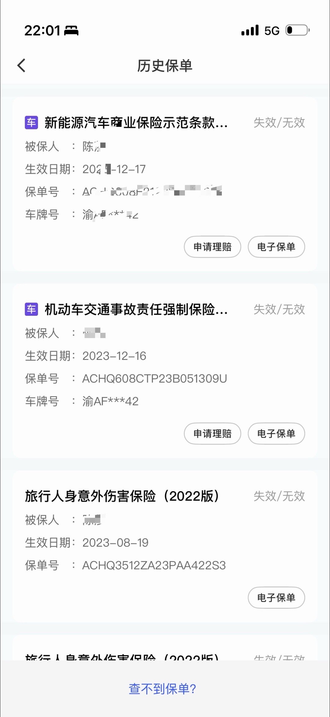 于是我又下载太平洋保险 App,这次手机号登录查询保单(图4),全是我老婆曾经的,应该是买 L8 的时候买保险留的我手机号。我寻思手机号登录,而不是保单登录,那我手机号名下其他保险单应该也能查到啊,而不是反过来我老婆名下曾经保单绑定了我手机号,那就默认我手机号只能查到我老婆名下保单吧?