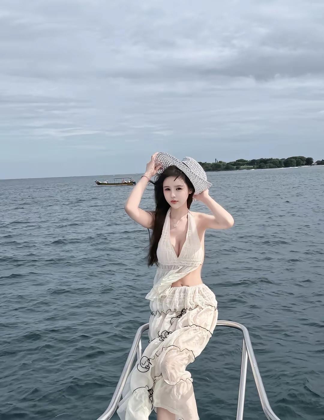 《舟中闲意》 云垂碧海意悠悠, 素袂轻飏逐浪流。 暂把尘缨抛棹外, 一襟风露满孤舟。 《海与白裙》 船舷切开蓝, 风把长发吹成帆。 草帽压着心事, 也压着一整片海的蔚蓝。 白裙在浪尖轻晃, 像一朵不肯谢的浪。 此刻, 世界退到身后, 我只和自己, 在海天之间, 慢慢摇晃。