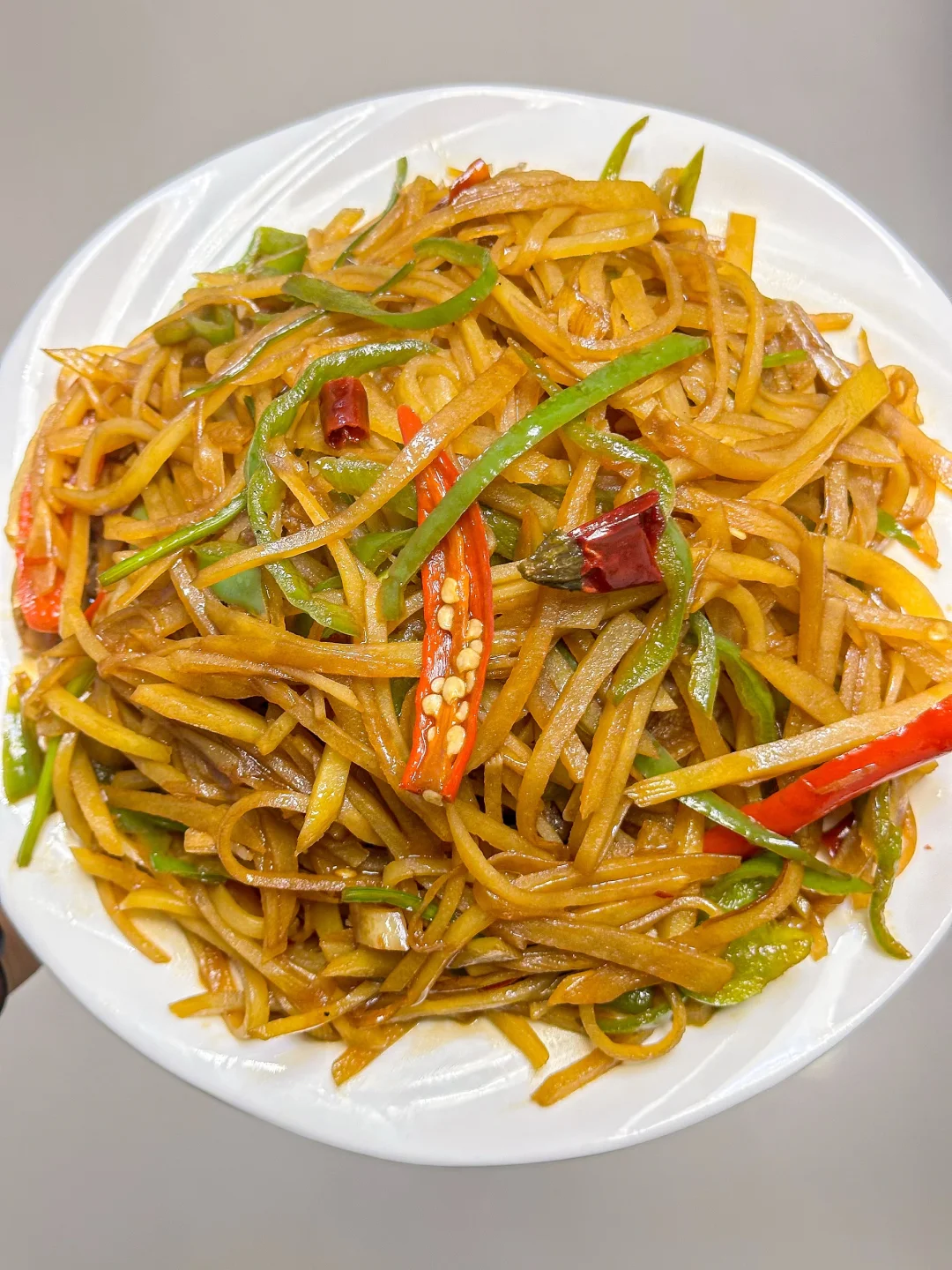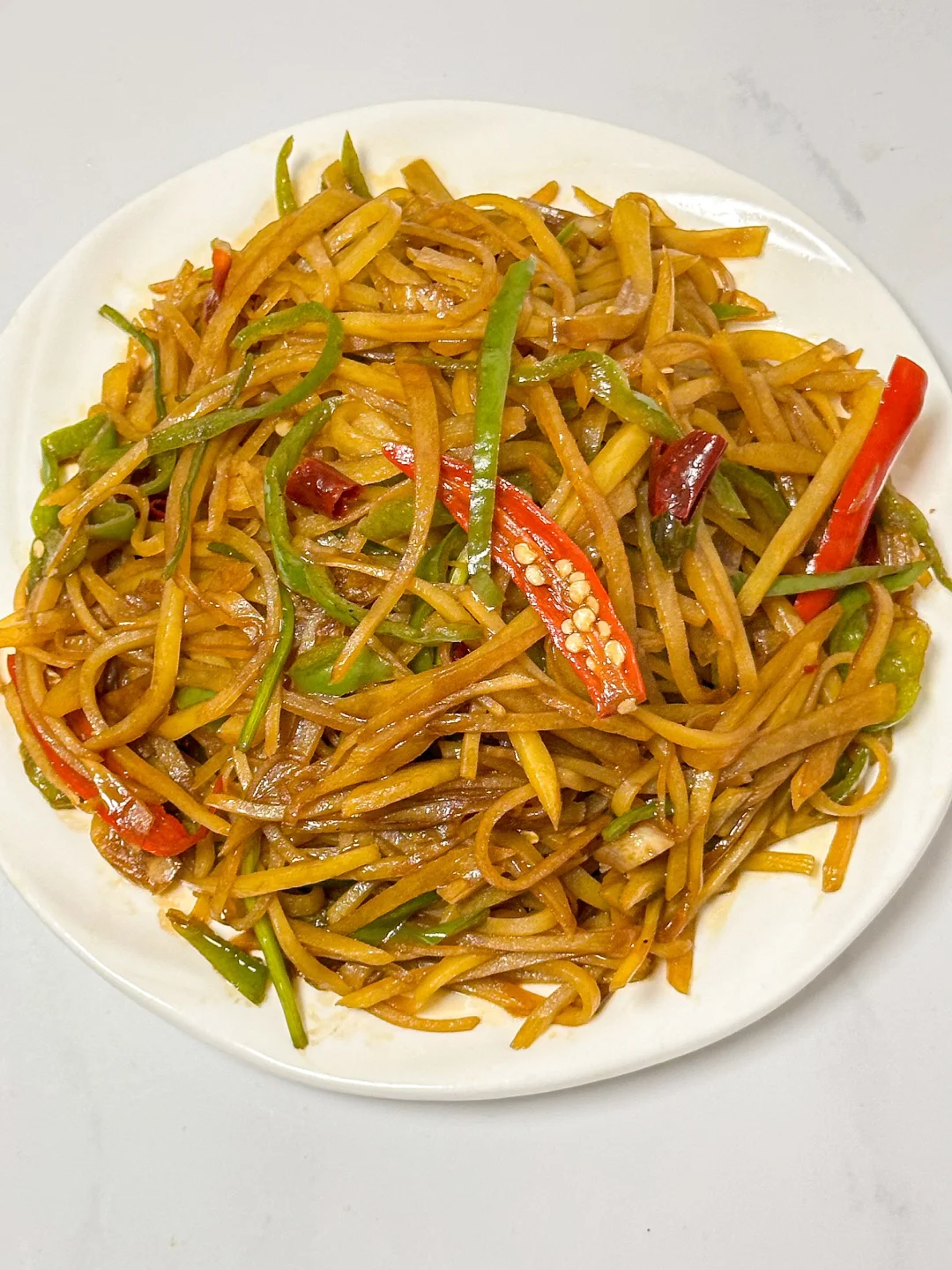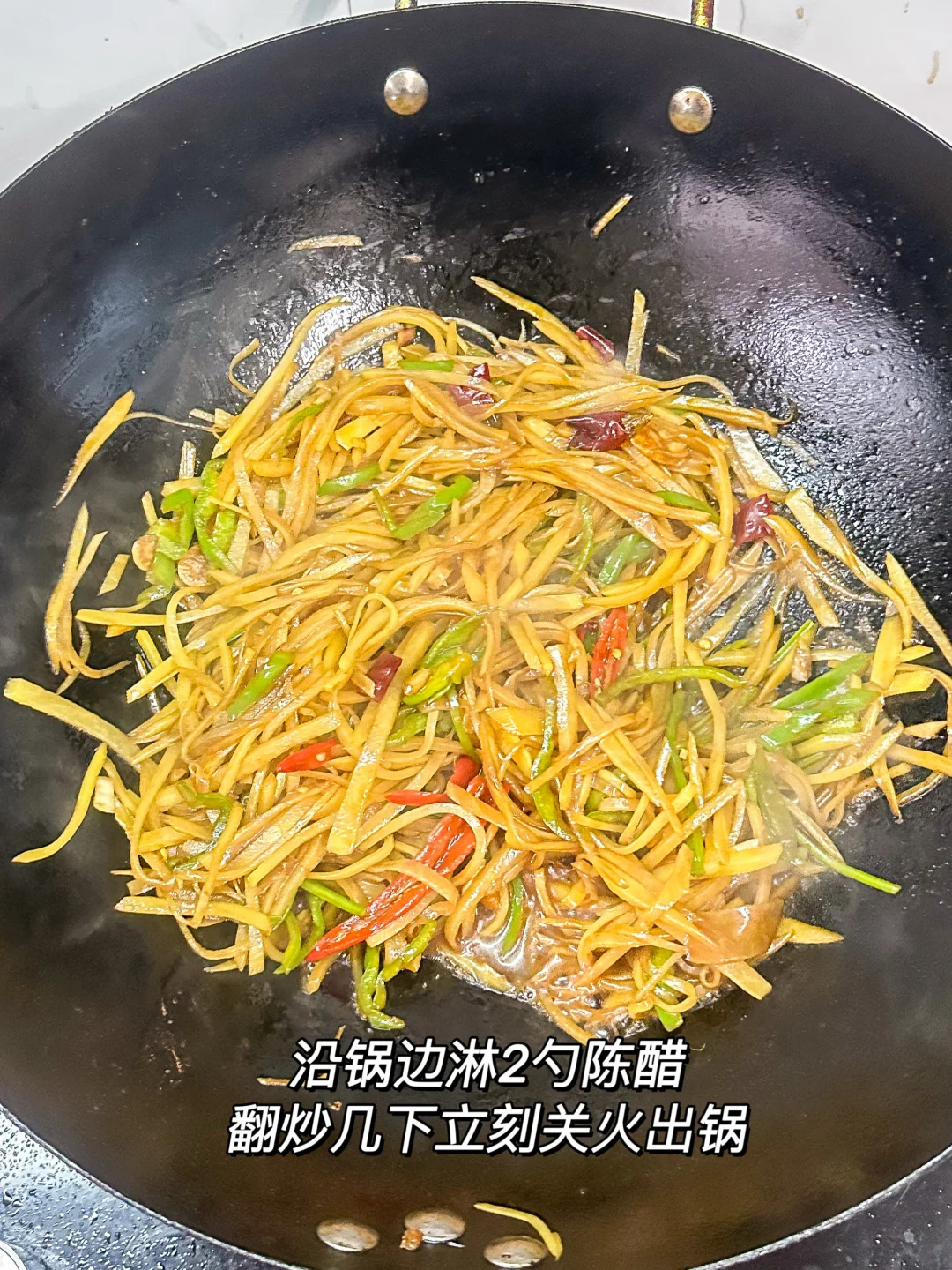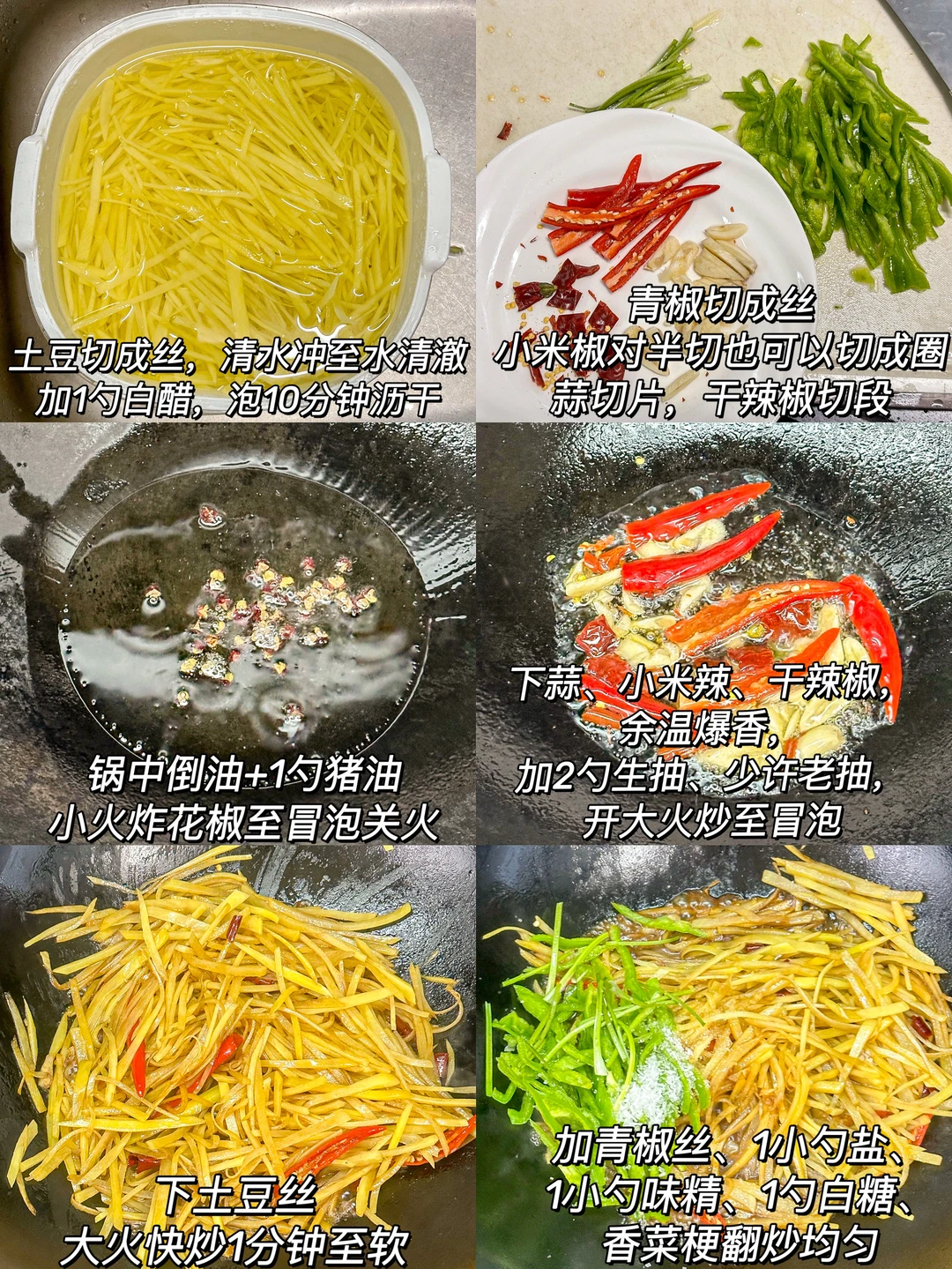 饭店必点的酸辣土豆丝也是被我get了🥹酸辣脆爽真的忒好吃了!!几分钟就被炫光了,百吃不腻😋做法还简单,快学起来💪🏻 🌟准备食材🌟 土豆2个、青椒1个、大蒜4片、小米辣3个、干辣椒2根、花椒少许、香菜梗 🌟做法🌟 1️⃣土豆切成丝,清水冲至水清澈,加1勺白醋,泡10分钟沥干,青椒切成丝,小米椒对半切也可以切成圈,蒜切片,干辣椒切段 2️⃣锅中倒油+1勺猪油,小火炸花椒至冒泡关火,下蒜、小米辣、干辣椒,余温爆香,加2勺生抽、少许老抽,开大火炒至冒泡 3️⃣下土豆丝,大火快炒1分钟至软 4️⃣加青椒丝、1小勺盐、1小勺味精、1勺白糖、香菜梗翻炒均匀 5️⃣沿锅边淋2勺陈醋,翻炒几下立刻关火出锅
