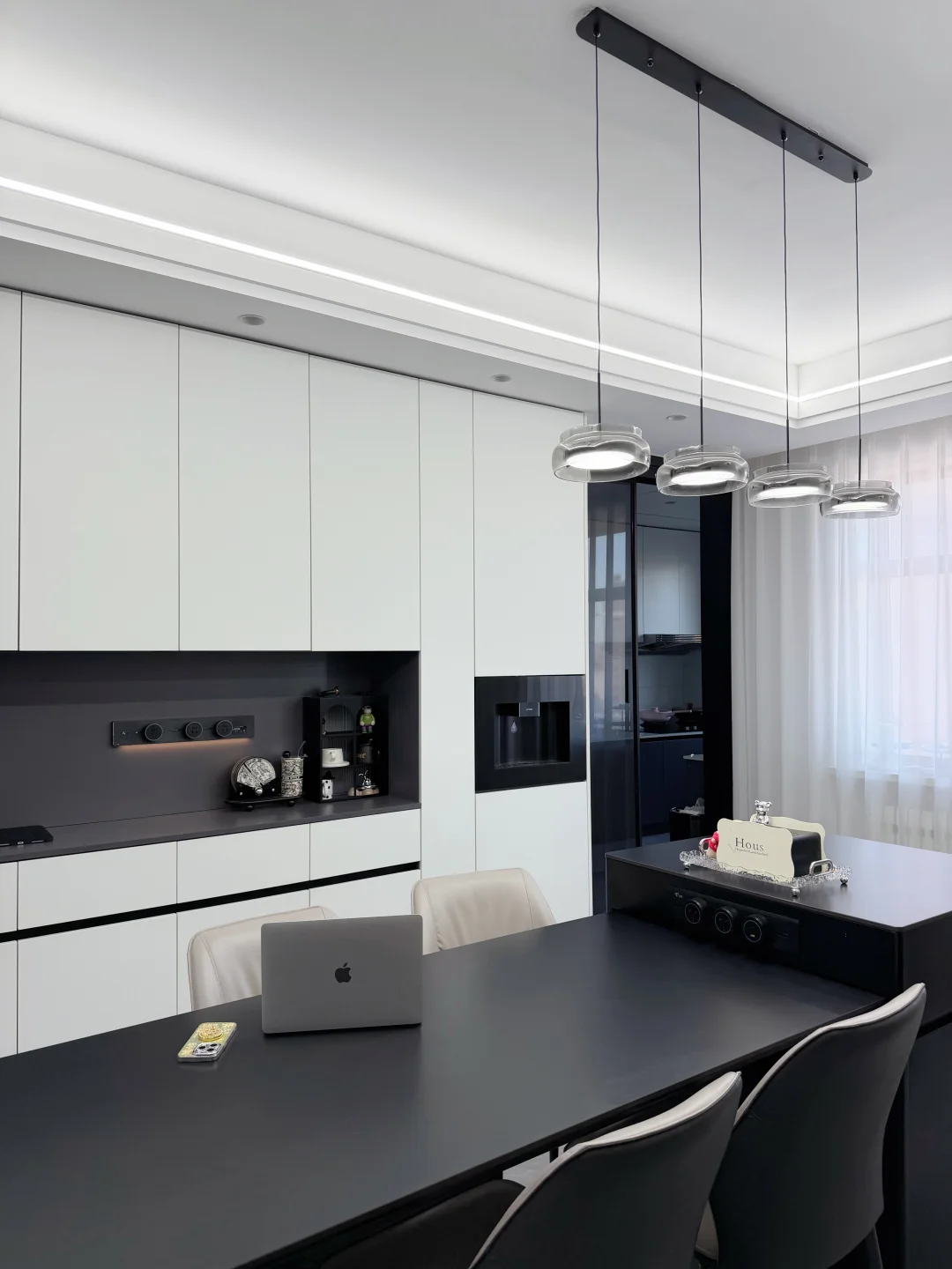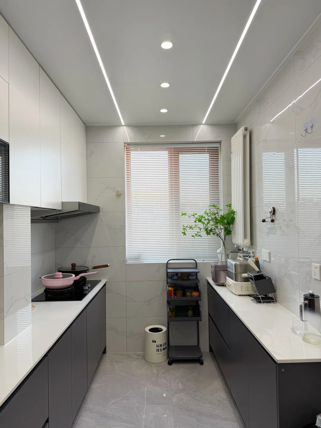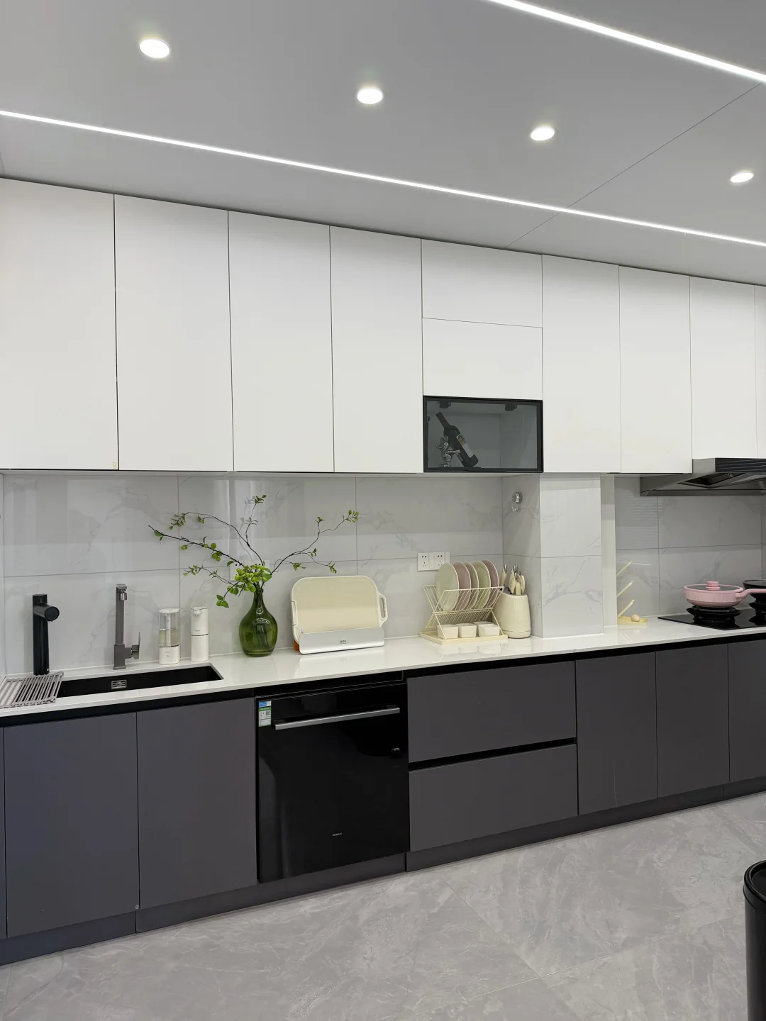 谁懂啊!这种简单干净的一字型厨房 真的越看越高级,越用越顺手~ 今天把细节全扒给你们! ✨尺寸&配色 总长4.8m×宽2.2m 柜子双视面材质,上暖白+下深灰 经典耐看,怎么搭都不翻车 能嵌的电器全做嵌入式,整洁度拉满 ✨墙面省钱小心机 40×80鱼肚白瓷砖 上下柜后面直接用免费小杂砖 省下的预算全拿来升级家电,香爆! ✨台面无死角设计 纯白石英石台面 不做挡水条+不下反 彻底告别卫生死角,打扫超省心 ✨吊顶显大又亮堂 蜂窝大板+线条灯 亮度颜值双在线 还好打扫,空间瞬间显大不止一倍 ✨开关自由 可开放可封闭 吊滑三连移门隐藏在餐边柜后 美观又实用,颜值实用性一把抓! 简单干净、好打理、还显大 这样的一字型厨房,谁看了不心动?