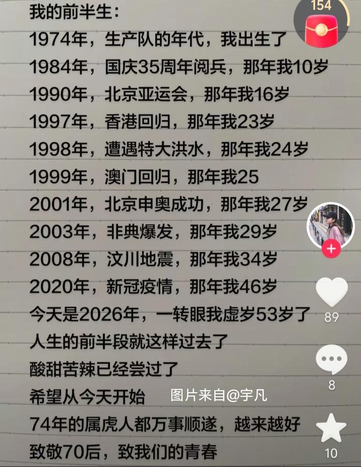 这也是我的人生前半段啊。刚才刷到头条,朋友总结的70后的人生前半段,我比他早出生两年,经历过人民公社生产队,经历过包产到户改革开放,经历过香港回归北京奥运,经历过扶贫支教抗震救灾,经历过非典新冠。 很小的时候在生产队摘烟叶挣工分。怀揣知识改变命运的梦想考上大学走出大山。在国家需要的时候去贫困山区支教也“躲”过了非典。香港回归的时候幸运地在深圳口岸欢迎解放军入港。北京奥运会的时候跑过一棒火炬手。四川家乡地震的时候返回家乡抗震救灾。当过官最终选择成为教师,在三尺讲台耕耘近30年。人生经历了很多很多,起起伏伏,酸甜苦辣,这就是我的上半生,犯过一些错误但一直心存一份善念。 虽然前半生有很多辛酸苦,但我一直觉得70后是幸运的,从农村到城市,经历人生的起起伏伏,我们这一代人接受最传统的教育,善良宽容,坚韧制作,有责任有担当,有梦想也敢于去拼,感谢那些过去的岁月。头号创作者激励计划