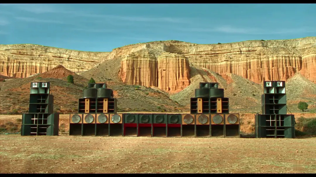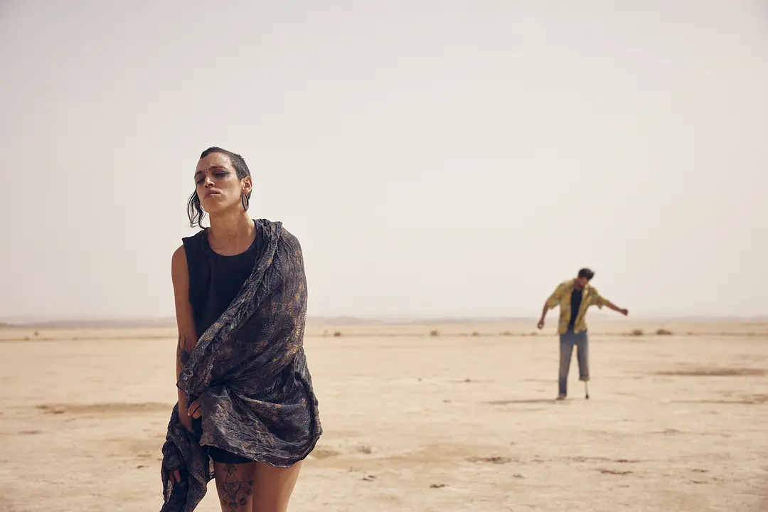 片名中的“Sirât”源于《古兰经》,在伊斯兰教末世论中指的是,一座在地狱烈火上悬浮着的通向天堂的独木桥。整部电影被赋予了极强的宗教寓意,但剧本的创作却又是完全世俗化的。故事在一个荒漠电音节中开启,在躁动的人群中,一个父亲带着幼子寻找着失散的女儿,直到狂欢散场依然未果,他们只能前往沙漠更深处的下一个电音节继续搜寻之旅。一路上突破了军事封锁,也趟过了穷山恶水,好不容易跟着几个电音的狂热信徒来到了终点,然而没有天堂,只有地狱。