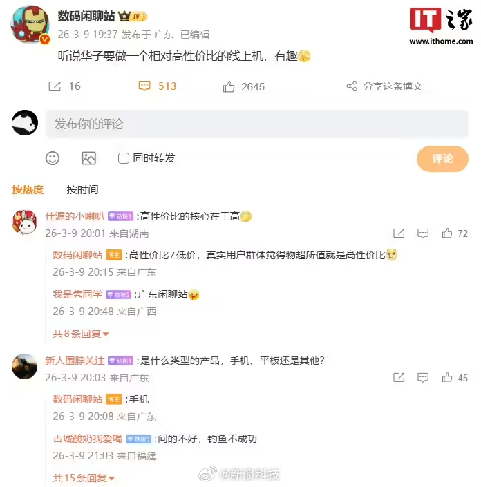 有网友表示:“高性价比的核心在于高。”博主回复称:“高性价比≠低价,真实用户群体觉得物超所值就是高性价比。”关于该机,目前博主并没有透露更多配置信息。(IT之家)