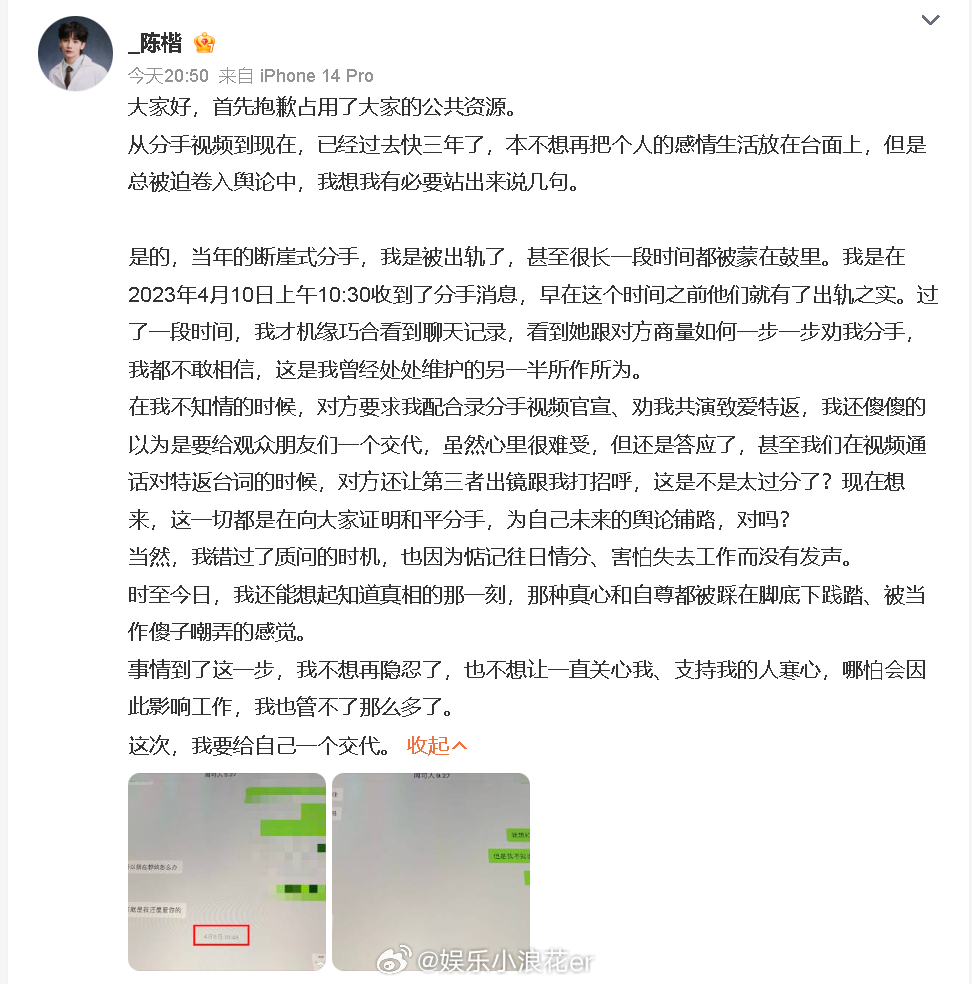 陈楷 当年的断崖式分手我是被出轨了周可人 陈楷 音乐剧演员发文,称自己早年和严小北(《中国唱将》选手)断崖式分手是被出轨,他还晒出女方和周可人(曾参加《喜人奇妙夜2》等节目)的聊天记录:“看到她跟对方商量如何一步一步劝我分手,我都不敢相信,这是我曾经处处维护的另一半所作所为。”