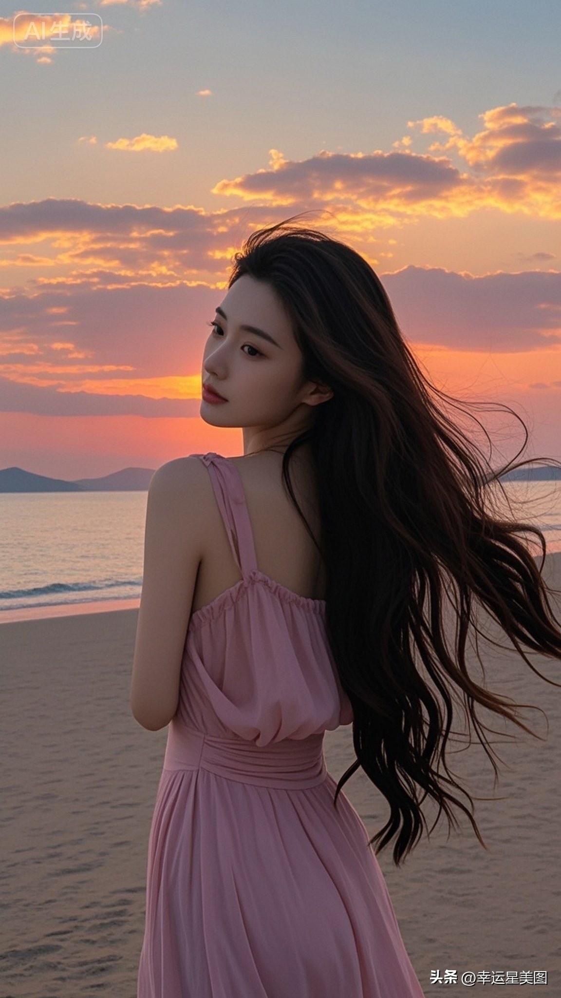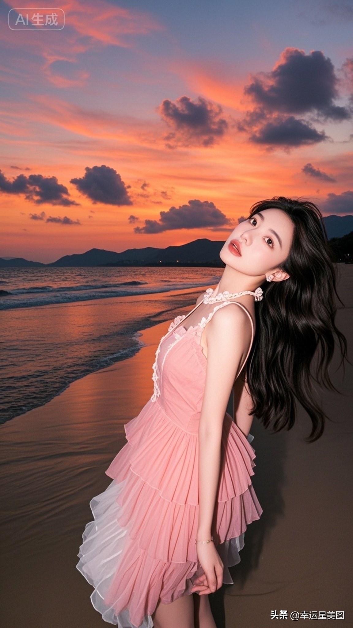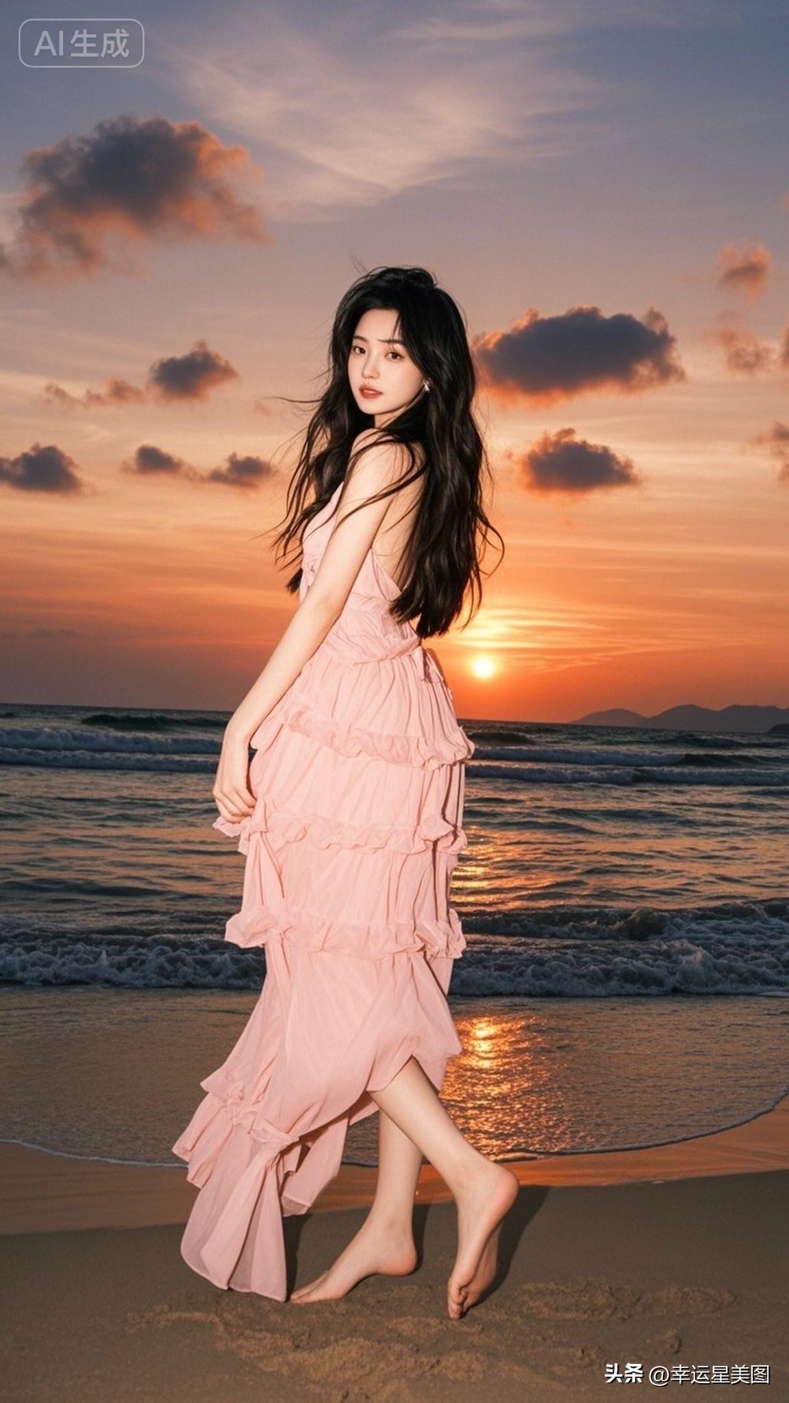 海边日落,粉裙飘逸,少女心满满