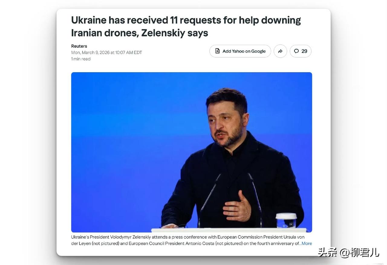 多国请求乌克兰协助对抗伊朗无人机? 乌克兰总统泽连斯基周一表示,在中东地区冲突一周后,乌克兰已收到来自伊朗邻国以及美国和欧洲的11个国家请求,要求其帮助击落伊朗发射的无人机。 泽连斯基表示:乌克兰在保护生命、相关拦截器、电子战系统和培训方面的经验表现出明显兴趣,乌克兰随时准备积极回应那些帮助我们保护乌克兰人民生命和乌克兰独立的各方提出的请求。 3月9日,泽连斯基在接受《纽约时报》采访时透露,乌克兰已经向约旦派出拦截无人机和技术专家团队,协助保护美国在当地的军事基地。