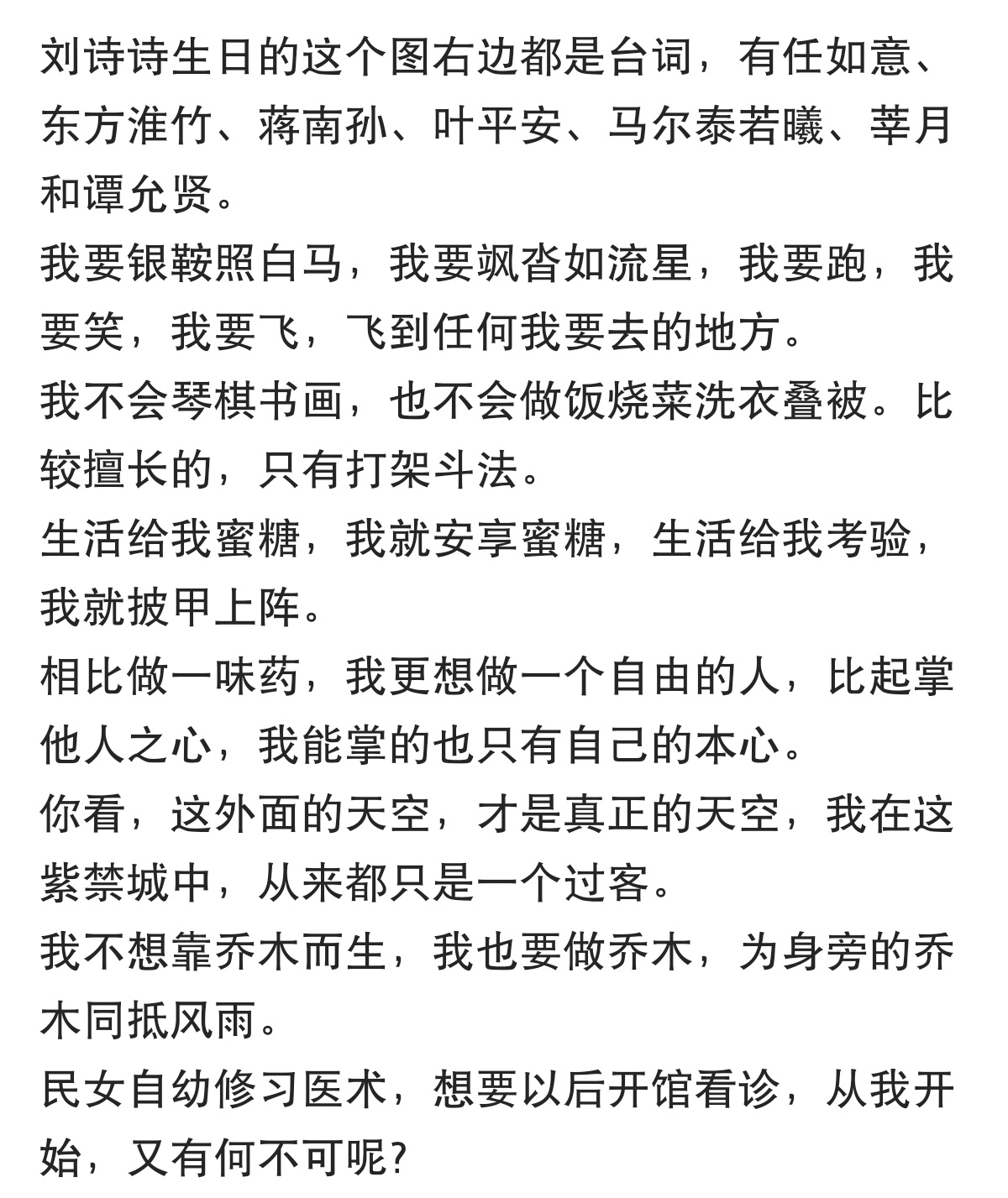 从这些台词里我感受到了刘诗诗强烈的生命力,向往自由的灵魂,不被定义的女性力量,独立自主的态度。感觉刘诗诗选择的角色和设定都是她的人生态度,本人和角色精神彼此呼应,我也希望刘诗诗是自由的