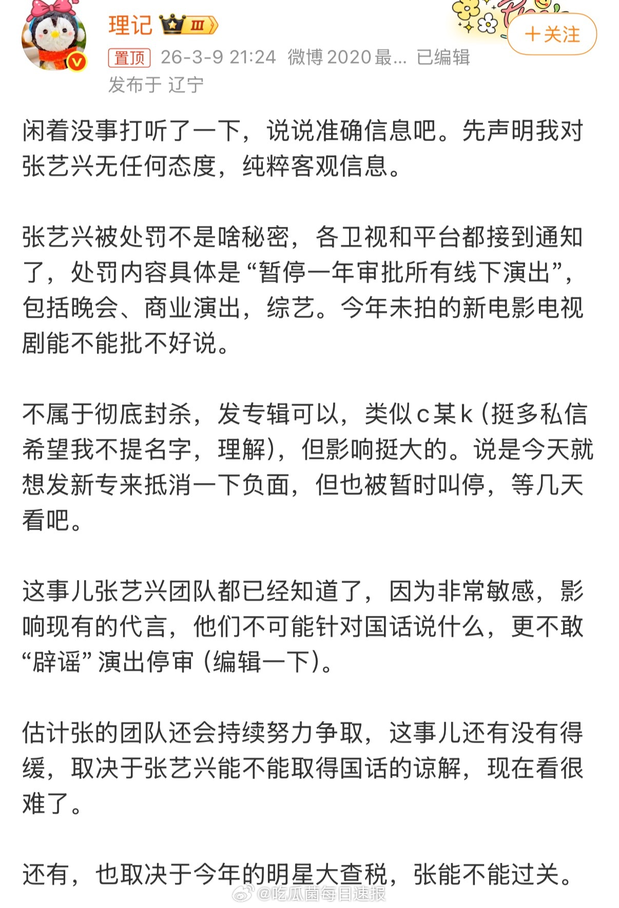 张艺兴工作室声明否认网传不实消息,并透露张艺兴目前处于术后康复关键阶段。