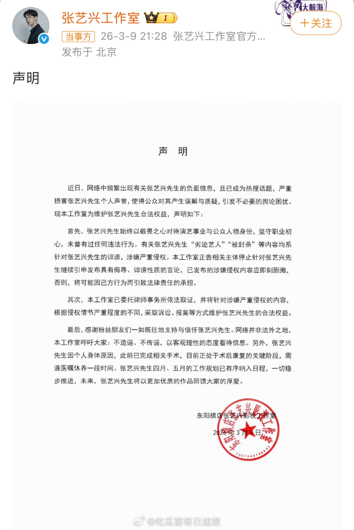 张艺兴工作室声明否认网传不实消息,并透露张艺兴目前处于术后康复关键阶段。
