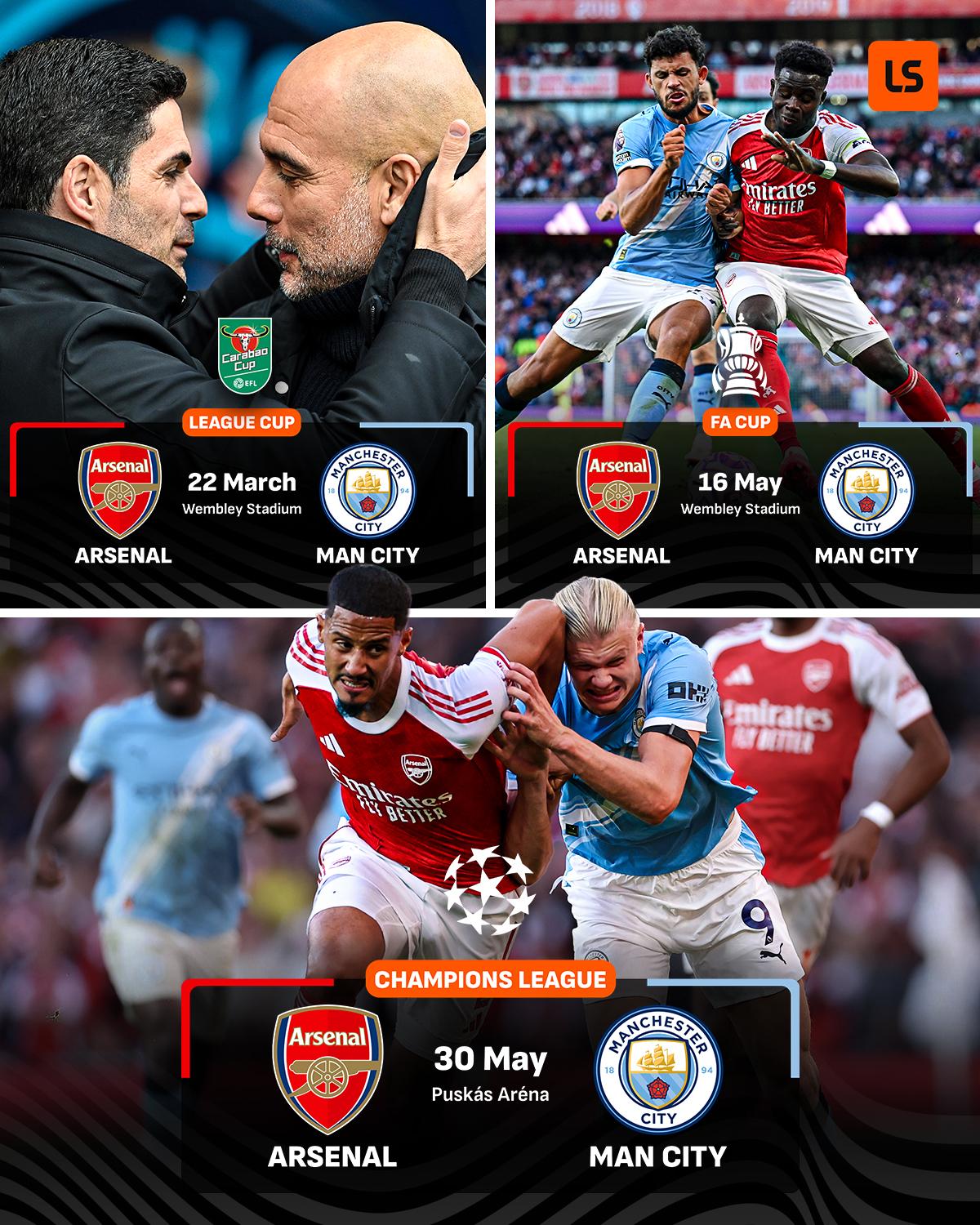 阿森纳和曼城都还在为本赛季的“四冠王”展开激烈争夺。如果阿森纳和曼城在所有杯赛决赛中相遇,以下是比赛时间: 3月22日, 联赛杯决赛(已定) 5月16日,足总杯决赛(待定) 5月30日,欧冠决赛(待定) 当然双方在4月18日还有一场英超天王山之战。