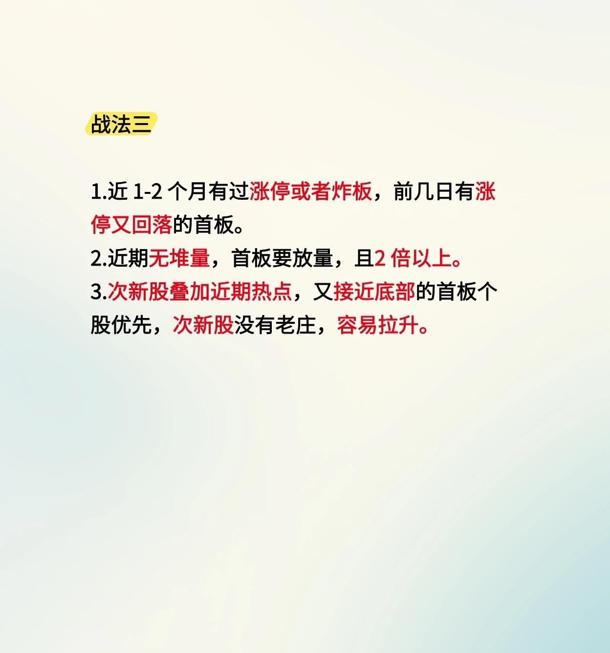 三种“首板涨停战法”,以下是言简意赅的总结: 战法一:缩量回调买入法 * 选股: 出现涨停后,观察3-5天,筛选出缩量下跌的股票。 * 买点: 当出现“地量”(成交量极低)且K线收出下影线时买入。 * 持有与卖出: 后续缩量小阴小阳可持有;若超过8根K线未收复涨停价则卖出。 战法二:涨停倍量阴洗盘法 * 条件: 昨日首板涨停,今日高开低走,成交量是昨日的2-4倍。 * 判断: 这种放大的阴线是主力洗盘。 * 买点: 加入自选,股价站上昨日阴线最低价即可介入。 战法三:次新热点首板法 * 形态: 近1-2个月有涨停/炸板历史,前几日有涨停回落的首板个股。 * 量能: 近期无堆量,但首板当天放量2倍以上。 * 优选: 次新股叠加近期热点,且股价接近底部。 * 优势: 次新股没有老庄,容易被拉升。