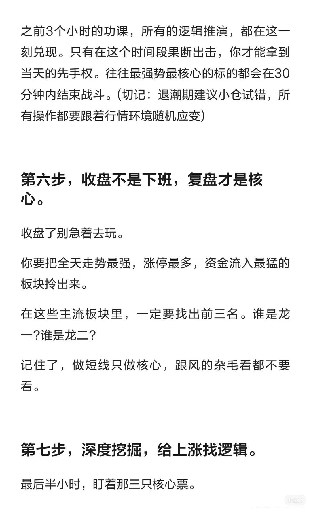 1. 早间研报(6:30起):先花1小时看国际新闻、海外行情及全球科技前沿(A股风向常受大洋彼岸影响,科技映射是关键题材);2. 国内资金(转内):1小时看财联社、雪球等平台,机构逻辑+散户情绪结合,感知市场风向;3. 锁定目标:打开同花顺扫热门板块与资金流向,将有效信息转化为自选股“猎物池”;4. 集合竞价(9:15-9:25):通过高开/低开榜辨资金贪婪/恐慌,确定当日操作方向;5. 黄金半小时(9:30-10:00):果断出击“猎物池”标的,拿当天先手权(退潮期小仓试错,随行情应变);6. 收盘复盘:拎出全天最强板块,找出前3名“龙一、龙二”,做短线只抓核心龙头;7. 深度挖掘:最后半小时盯核心票,结合主流信息挖基本面逻辑(逻辑硬才敢拿大牛股)。