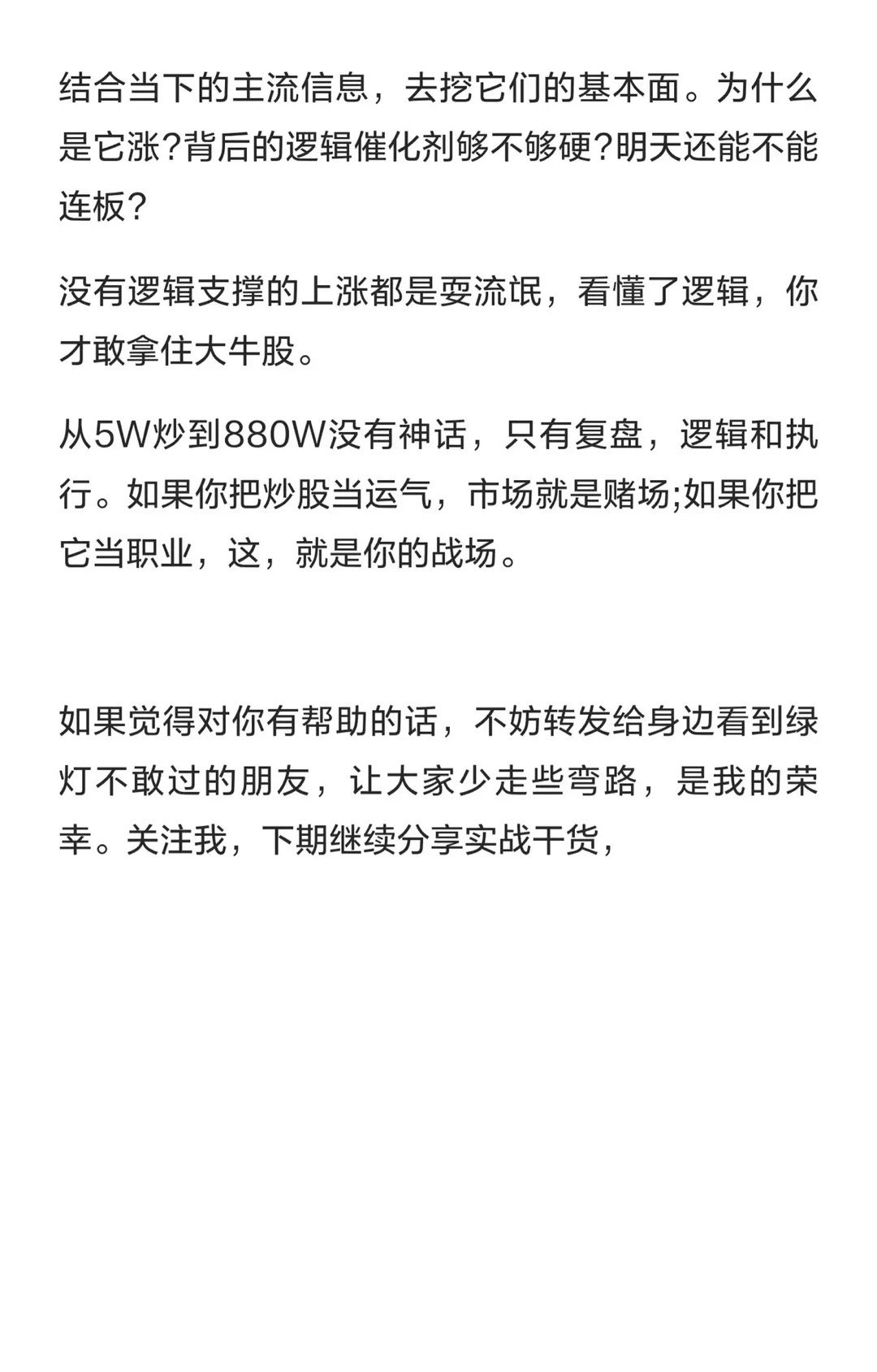 核心逻辑:把炒股当职业,靠“复盘+逻辑+执行”取胜(而非运气),短线只做核心、跟风杂毛不看。