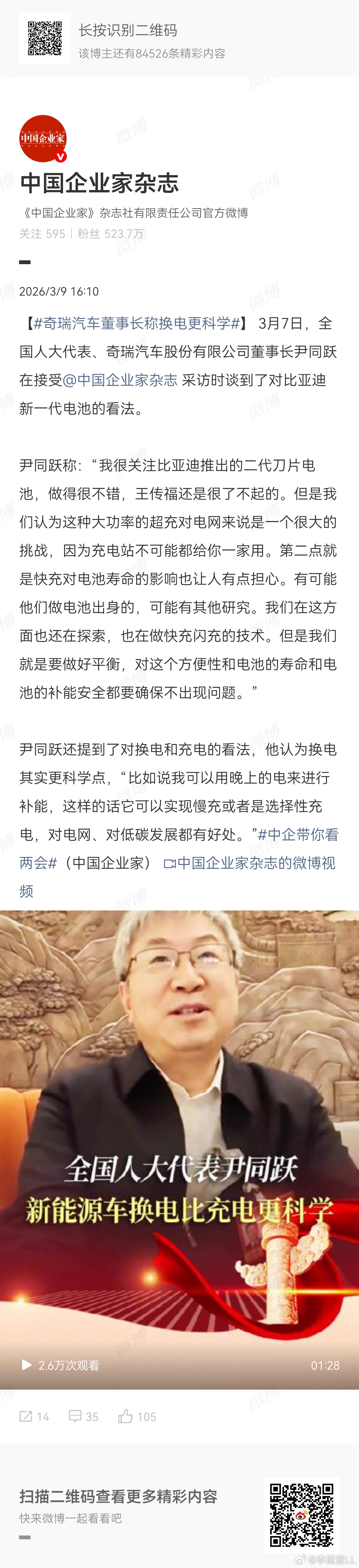奇瑞汽车董事长称换电更科学