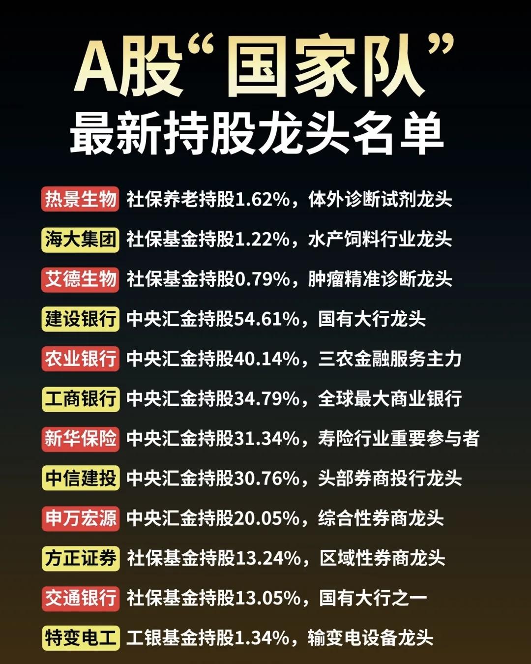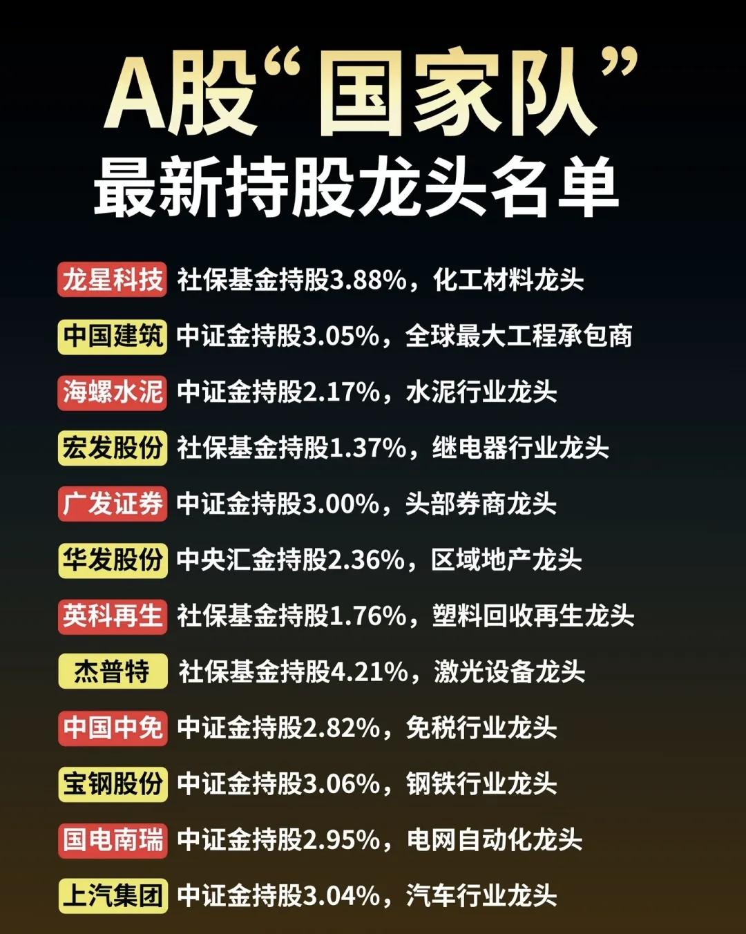 炸了!A股“国家队”最新重仓龙头名单流出,这40+公司被社保/汇金/证金集体锁仓! A股“国家队”最新持仓龙头名单曝光!从银行、券商到基建、科技,社保基金、中央汇金、中证金重仓的细分龙头都在这里了。这些公司不仅是行业标杆,更是市场压舱石,值得重点跟踪。 国家队持仓是重要的市场信号,但并非买入指令。其操作周期长、风险偏好低,与个人投资者的短期交易需求不同。投资决策需结合自身风险承受能力和市场环境综合判断。