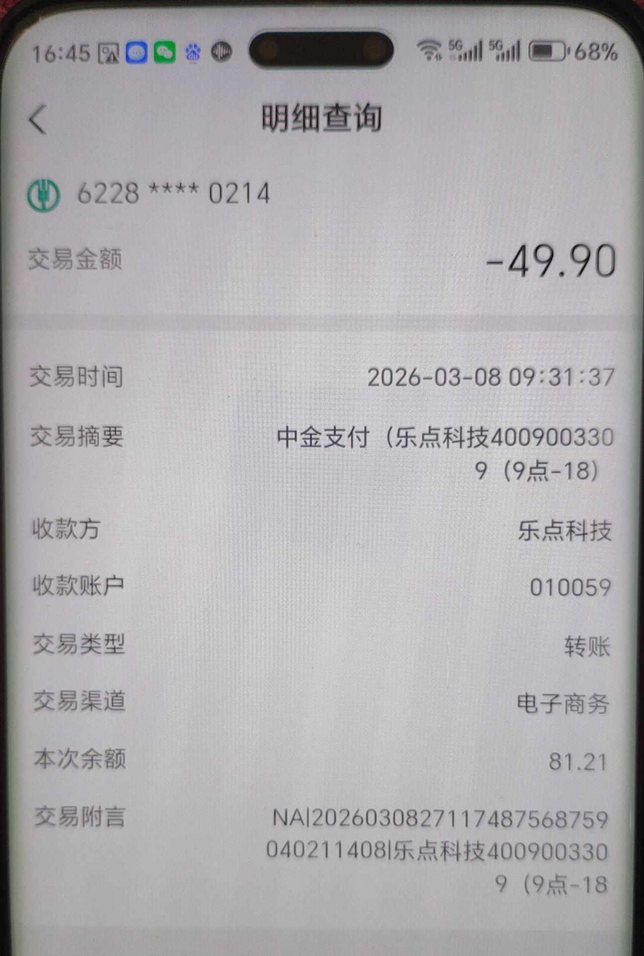 人要是遇上倒霉点了,一步不顺,步步不顺。 这不,前几天修球拍,除了遇到了一个爱占便宜不懂事的人外,前天又收到联通公司催还欠费的通知。 不对啊!我有两个套餐电话卡,都是包月年交费。这么多年来,一直正常使用,从来没有欠过费。 经过去联通营业厅讯问,得知是我的主卡号码欠费了,而且金额不少。通过服务员的分析,可能是换了新手机,主副卡使用颠倒,产生了如此高的费用。 对于这样误操作产生的高额费用,服务员建议去10010投诉,一定会给予退款。 还好,我投诉后,联通公司给了回复,说三百五十多元的费用,只能退二百元。我说,不行,退的太少。又经过交涉,最终给退回金额三百元。 事情还没结束,昨天下午,躺着看手机,顺便查了一下银行卡上的明细。这一查不要紧,怎么突然出现了一栏“中金支付”扣款项目,金额49.9元,落款单位:乐点科技。交易类型:转帐。交易渠道:电子商务。 不对啊!什么乱七八糟的,我从来没有与"乐点科技"打过交道,怎么我银行卡里的钱,未经过我的同意,就悄悄的被人划走了呢? 看到这里,我立刻奔赴银行讯问扣款原因,他们的解释是,是我在上网的时候,无意中点到了某个项目,人家误以为是你自愿下单购买,所以手机银行自动扣款了。 我这一听,这都是些什么东西呀!这和抢钱有什么不同?不都是网上暗中设的圈套吗? 我立刻找到银行主管负责人,让他指导我,把手机银行里,凡是自动扣款的各项目,一律删除掉,一个不留。这样一来,不给外来者留下一点机会,让这些骗子们,扣款也无门了。 经过我的这一番折腾,我得到了这样的经验教训。手机确实给人们的生活,带来了方便。但是,方便的同时,也来带了风险。尤其是我们这些老年同志们,在操作手机的时候,一定要擦亮眼睛,精神集中,千万别见利妄为,为了一点蝇头小利,掉进人设圈套里。 现在想想,真的是太危险,太可怕了。处处是陷阱,处处是大坑啊!