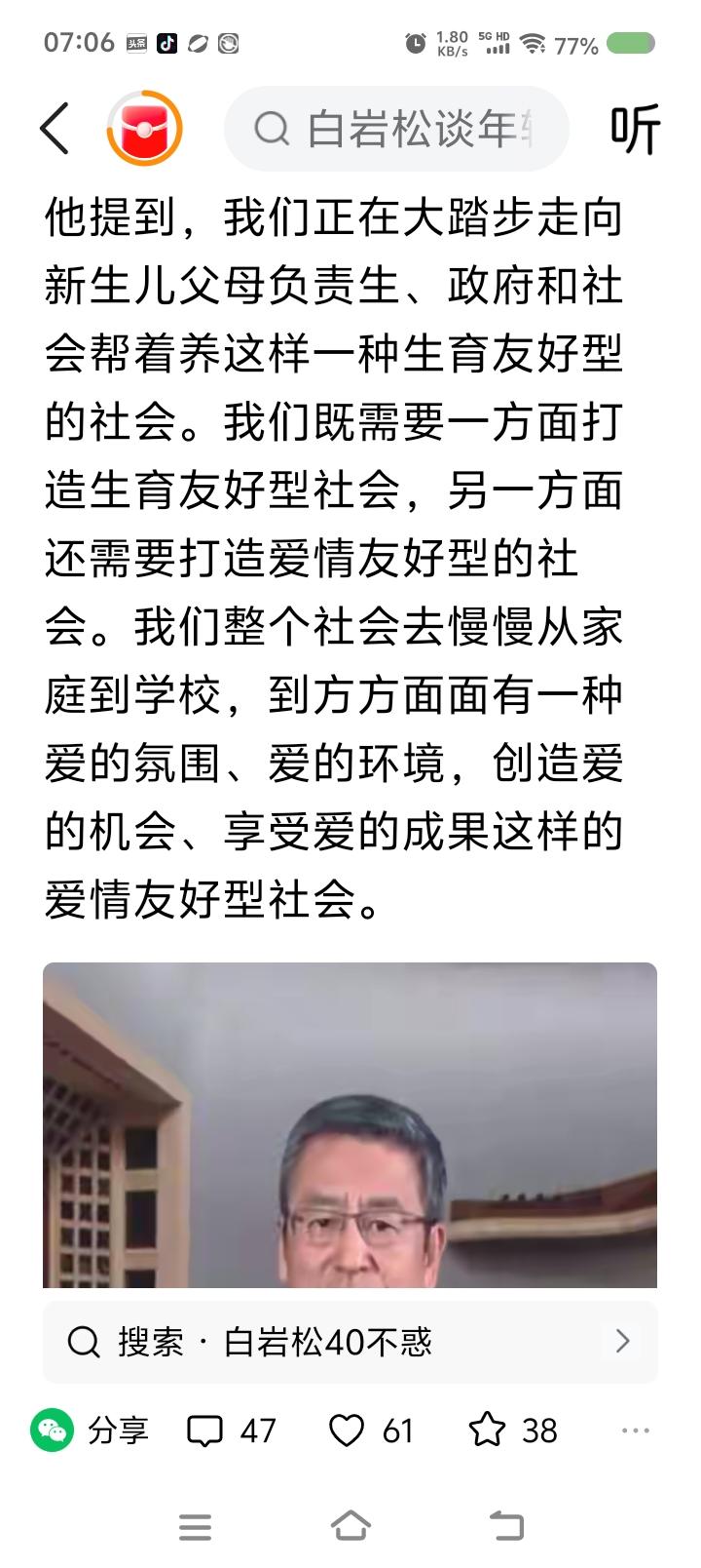 白岩松还没有退休?—— 据报道,白岩松认为中国在走向“年轻人负责生、国家和社会负责养”的“生育友好型社会”,但年轻人处于“爱无力”状态,因此还要打造“爱情友好型社会”。 点评: 白老师,多少人看着你的节目长大的。他们有了孩子,甚至有了孙子,你还在工作,为中国年轻人的爱情、生育操心! 我很感动。 “北京这么大,我想去看看。我要寻找爱情,我要在北京生孩子。” 导演,我这么说,行么? 想起一段台词:“打仗我承认不如你,但要讲爱情,我是你老师。” 陈赓同志,你没有把“爱情战”写进教材,遗憾。