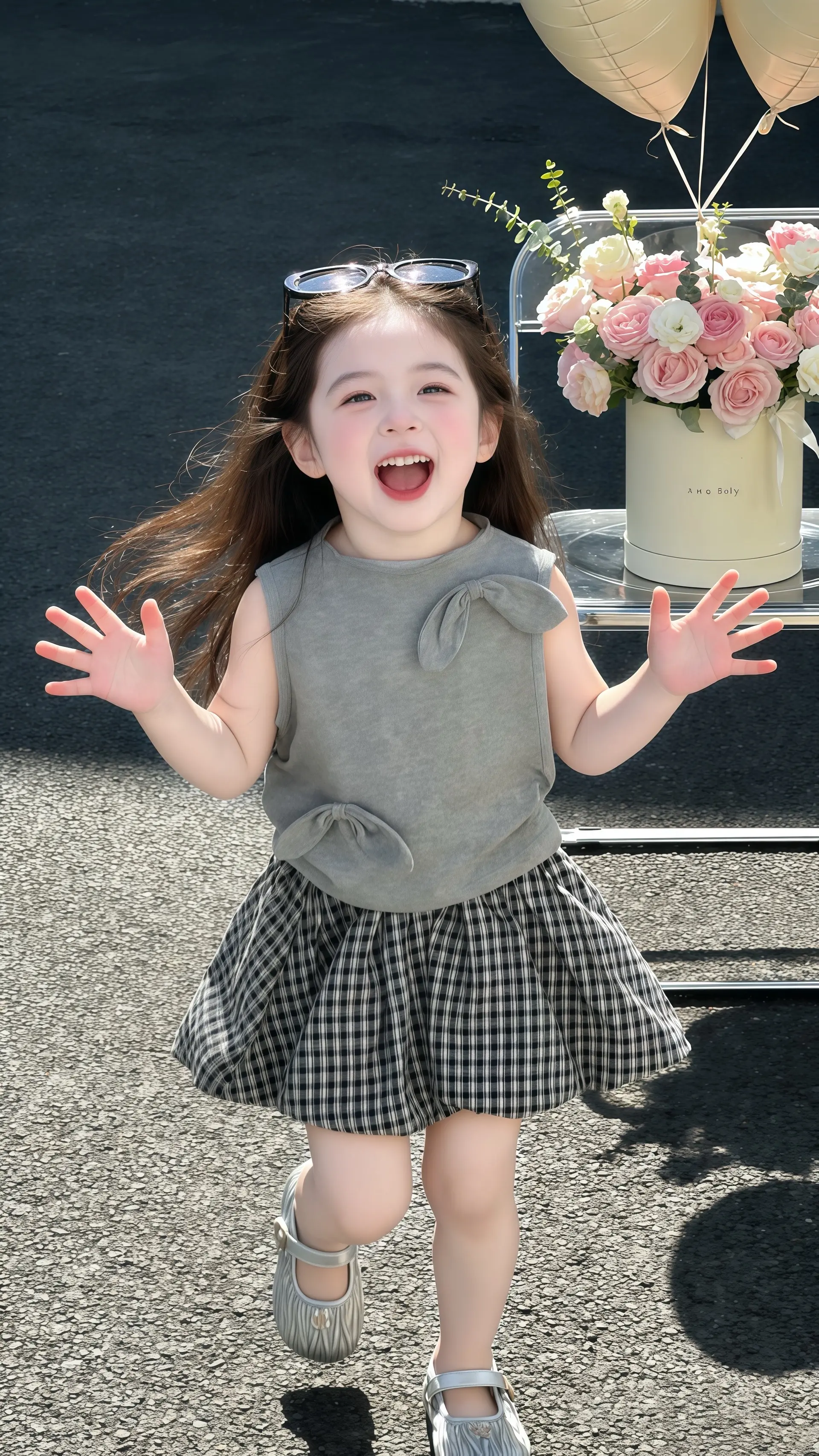 娃弯着腰笑开花,灰开衫软乎乎像“裹了片薄雾”,粉纱裙晃起来像“盛着团樱...