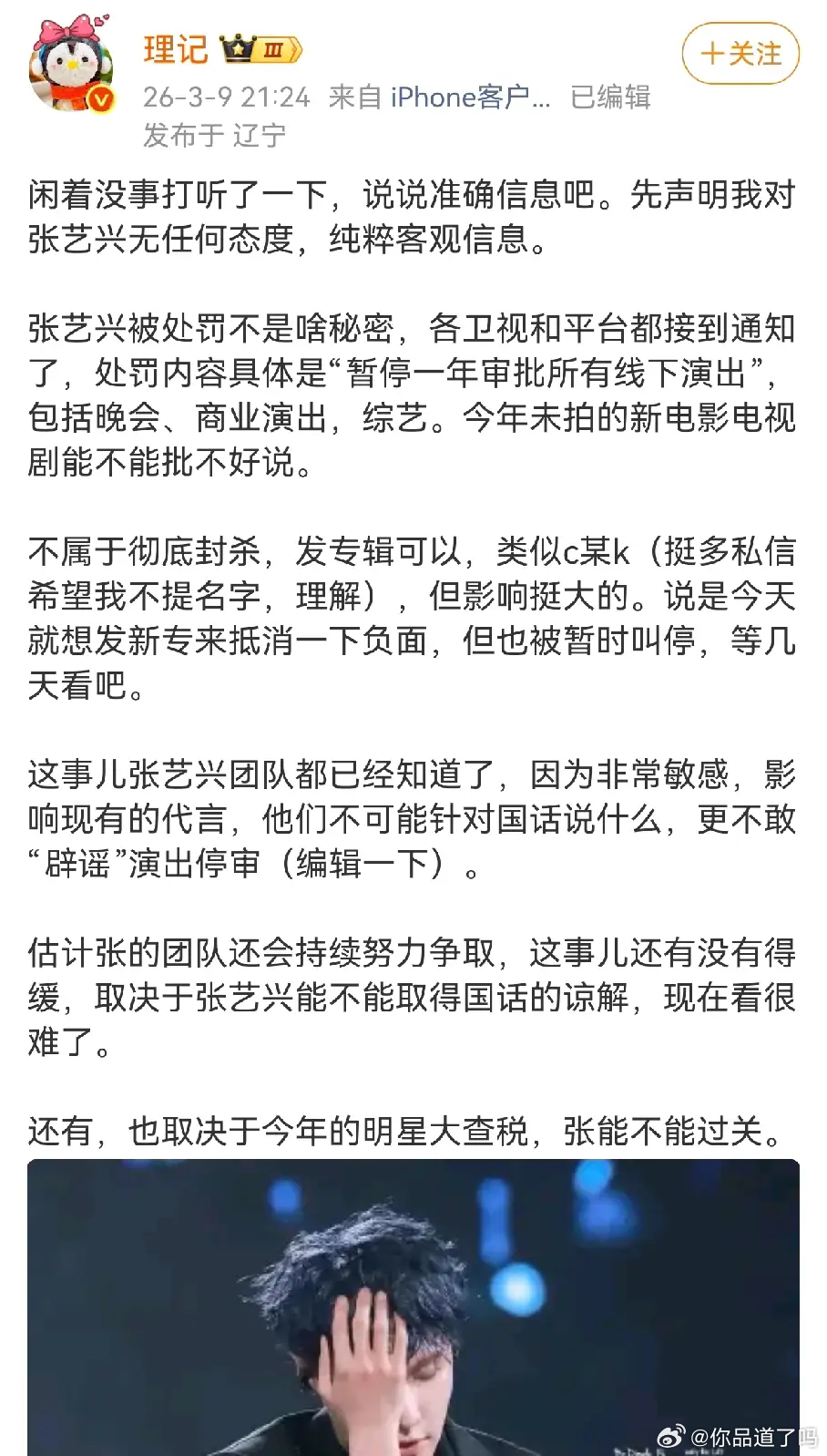 理记居然直接点名张艺兴了!他爆料说张艺兴被罚了,不过不是那种很严重的处罚。说张艺兴还能发专辑,但晚会、商业演出和综艺这些就别想了,得暂停一段时间,跟之前某个C姓艺人情况差不多,只是张艺兴这是暂时的。张艺兴工作室刚发完律师函辟谣,然后理记硬刚张艺兴工作室声明,也不知道他是真不怕被告,还是真觉得自己说的是事实。这事儿是真是假,看看张艺兴接下来有没有主流活动就知道了。反正他本人是没什么问题的,工作室都说了是恶意造谣嘛。
