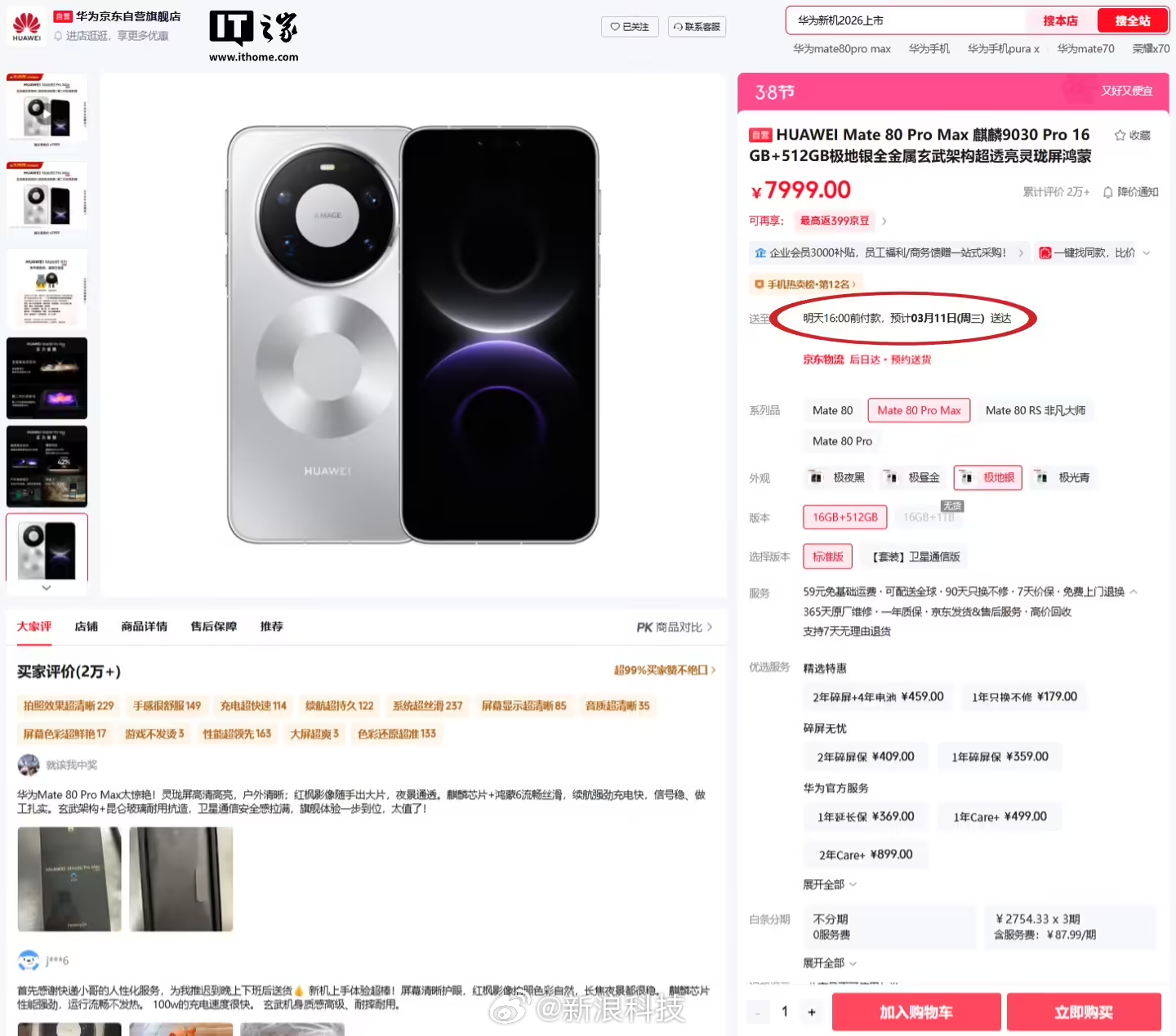 目前华为 Mate 80 系列手机已现货开售,以系列机型最难买到的 Mate 80 Pro Max 为例,该机「极地银」配色最新送达时间已提前至 3 月 11 日(此前显示为预计发货时间,且最快的发货时间为 4 月 5 日前)。