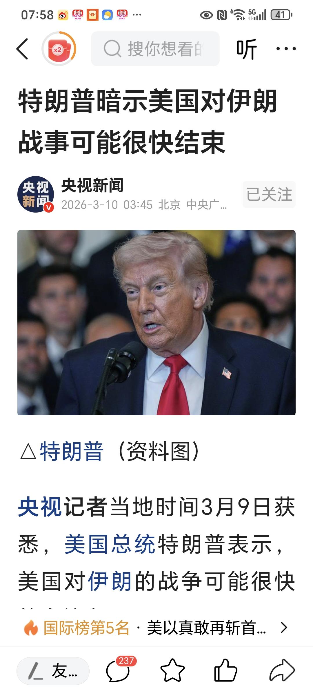 特朗普称对伊战事“已基本结束”:伊朗现在没有海军、通讯设施、空军,导弹所剩无几,无人机被摧毁,心中已有人选接替穆杰塔巴,仍考虑控制霍尔木兹海峡 哈哈,特朗普宣布可以结束战争,看看伊朗答不答应?特朗普这是在幻想吧。果然跟莫老仙一个尿性,单方面宣布胜利,主打一个脸皮够厚,我不尴尬尴尬的就是别人,任何轻视敌人的人,最后结果都不好,不要自以为是。喊口号没用,反动派你不打,它不倒。 特朗普总统在接受 CBS 采访时透露: “我认为这场战争已经非常彻底了!他们没有海军,没有通讯,也没有空军。” 美国目前的进展远远快于最初预计的 4–5 周时间表。 行动取得了巨大进展,很多目标提前完成。与此同时,市场情绪迅速回暖,美国股市正在强劲反弹。 网友,特没普一点诚信都没有,不要听他胡扯淡,安保措施还是要做好,防止美以的阴谋诡计。老特借坡下驴还体面点,要不陷进去恐怕出不来,伊朗不是好对付的。这就是伊朗说的8小时后的好消息。和平万岁。本就为中期选举,如果这样肯定要了,以色列和犹太也得罪了,以色列一点退路没有,无法中东立足了,除非伊朗答应了什么给美国和以色列