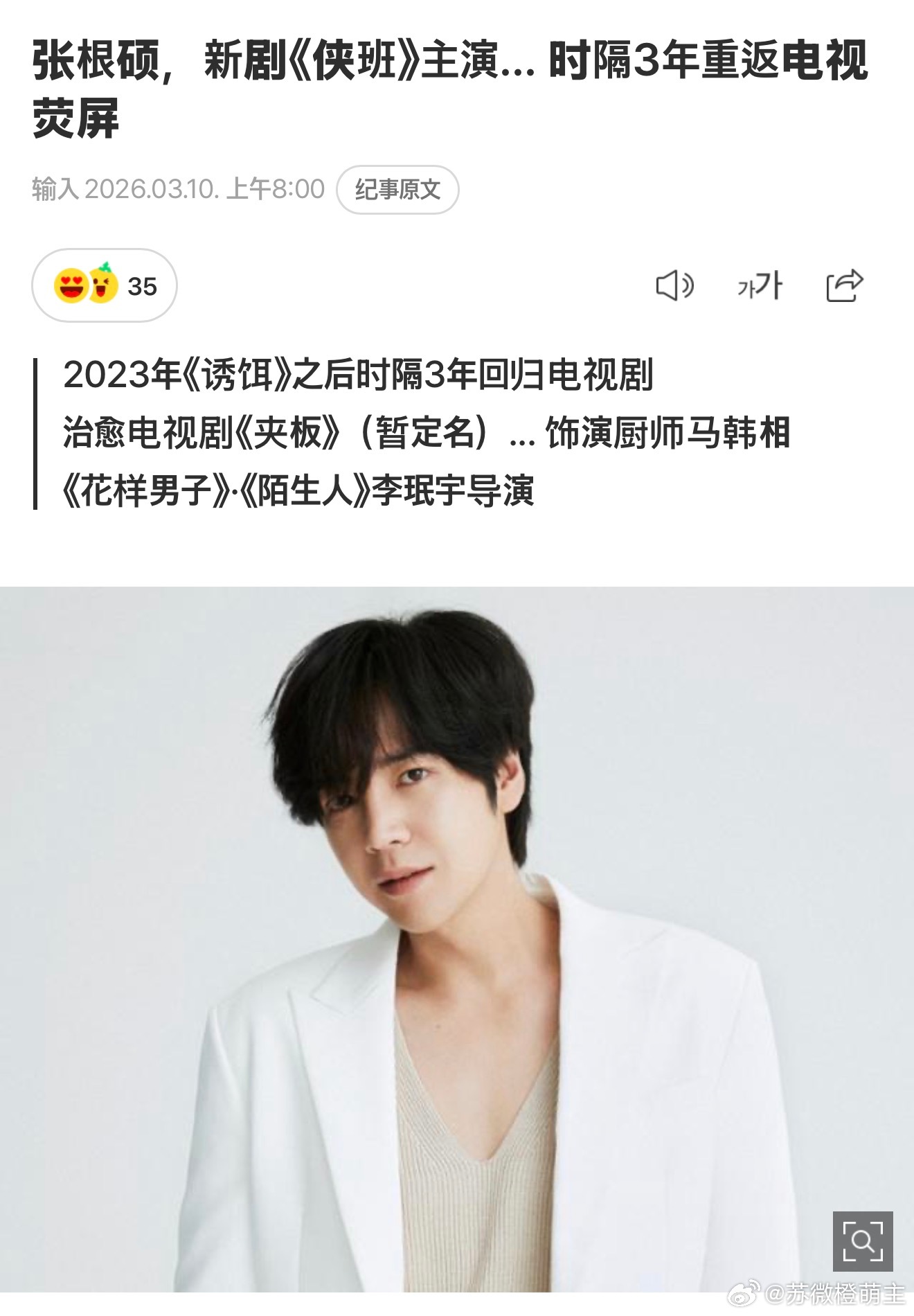 张根硕,新剧《侠班》主演... 时隔3年重返电视荧屏亚洲王子张根硕将携新剧回归。 担任《侠班》(暂定名)主演,时隔3年回归家庭剧场,正式投入作品活动。10日上午,据本报采访张根硕将在《侠班》中饰演主人公马韩尚。 《侠班》是一部治愈电视剧讲述了厨艺出众的黑社会马韩尚救出面临危机的大学生后,躲在他家里生活,以一顿热腾腾的饭为媒介互相安慰和支持的过程。该小说改编自在日本被制作成单行本和电视剧的同名小说。 张根硕平时通过节目展示了高水平的料理实力b因此与角色的相似度也备受关注。导演由曾执导《花样男子》、《神的测验第四季》等作品的李珉宇导演担任。 以人物为中心的细腻的演出获得了好评,因此与张根硕的合作也备受期待。《侠班》预计将于2026年上半年开拍。