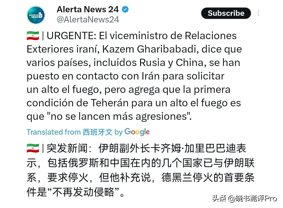 中国的表态,伊朗听进去了!伊朗首次松了口!3月10日,根据外媒报道,伊朗外交部副部长加里巴巴迪表示,包括中国和俄罗斯在内的几个国家,他们已经联系伊朗,要求停火。关于停火,德黑兰的首要条件是不再发动侵略。很显然,伊朗的这一表态,这事实上这是冲突升级之后,伊朗首次回应停火问题。 伊朗专门表示,中国打了电话,表达了停火的立场,这说明对于我们的表态,伊朗很重视,这样的公开表态,也是对我们关切的积极回应。这一回应,无疑从侧面说明了中国在中东的分量与话语权。当然,伊朗此番回应,有给我们面子的考虑,更为重要的是,伊朗完全认同了我们的立场。 伊朗借着我们的表态,顺势开出“不再发动侵略”这一条件,某种程度也是以我们的立场作为背书,把中国的主张,转化成了自己的外交底线与谈判筹码。很显然,从此时此刻起,伊朗外交谈判的大门已经打开。伊朗无疑凸显了自身负责任的姿态,证明自身无意于扩大冲突。 而中国从中扮演的角色,各国当然也看得见,而接下来就看美国如何接球?如果美国对此视而不见,那美国就不得不承受国际社会普遍期待停火,降温的压力,美国的所作所为将会被更加的被孤立和反对。而如果美国顺坡下驴,这一次冲突有可能很快实现降温。