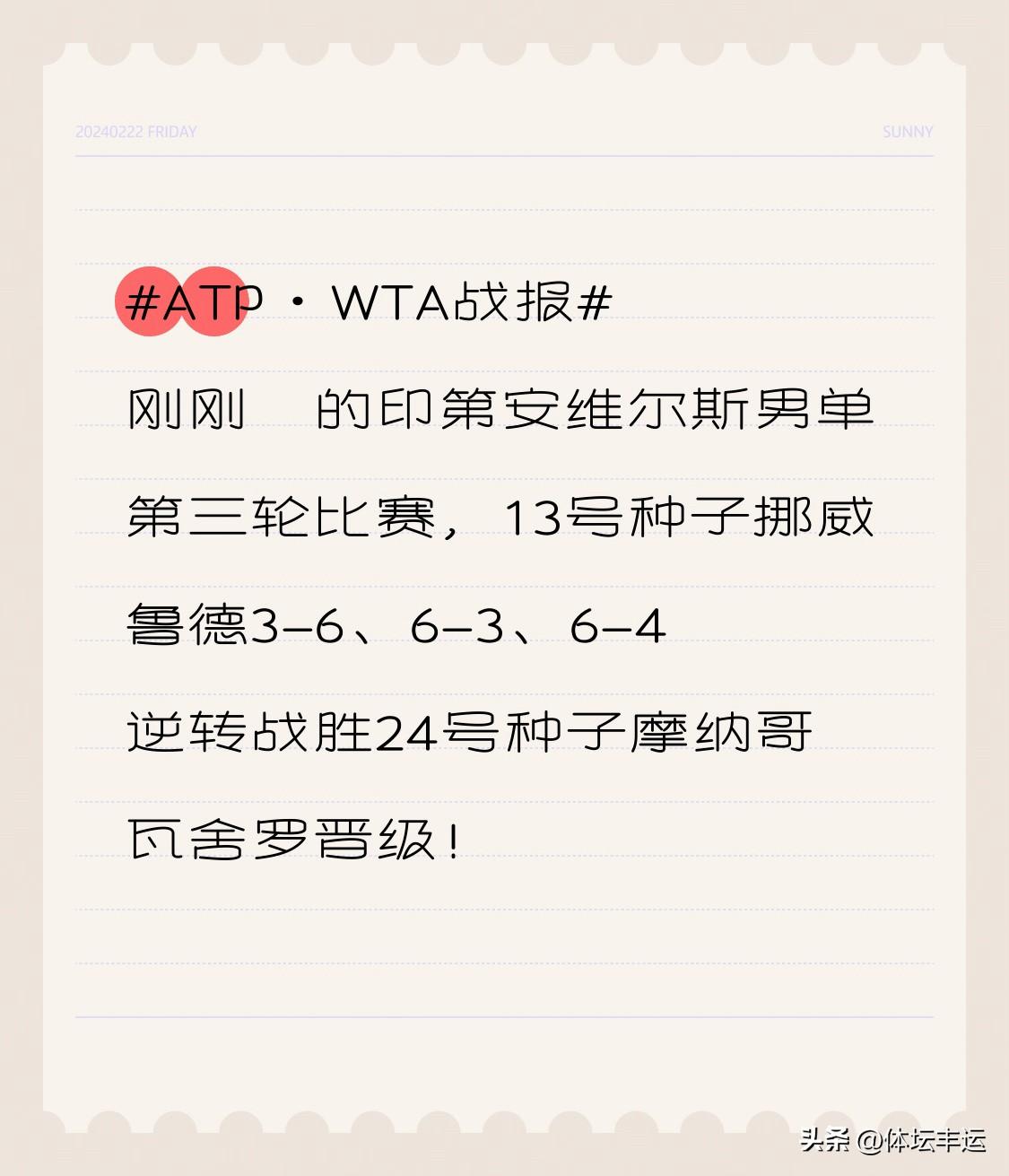 刚刚🔚的印第安维尔斯男单第三轮比赛,13号种子挪威鲁德3-6、6-3、6-4逆