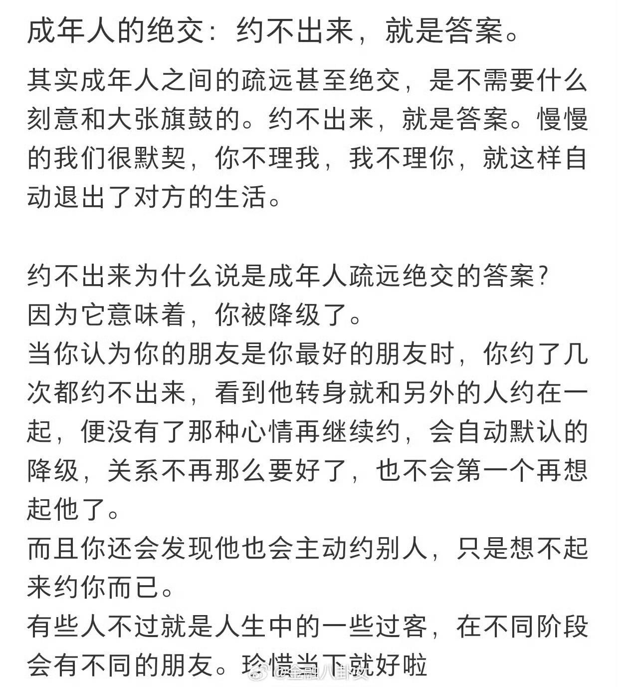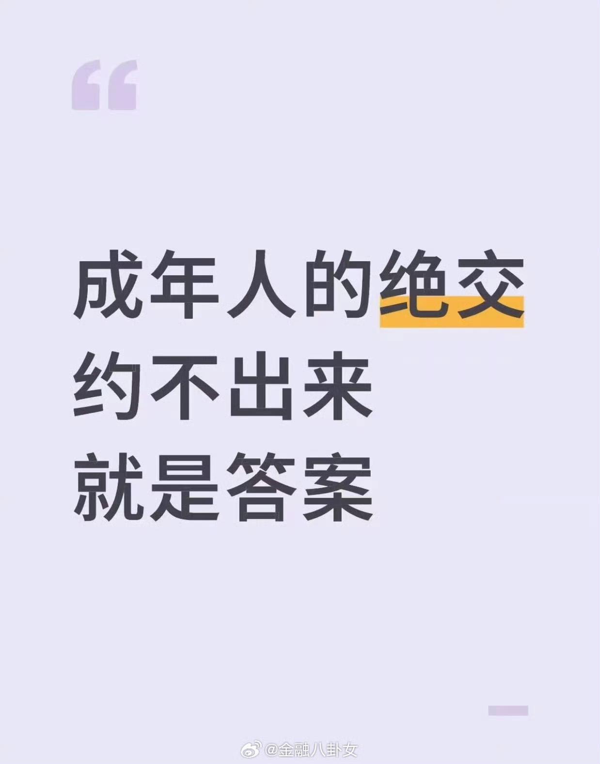 成年人的绝交,没有那么多虚头巴脑,被坑了,那就绕着你走,谁离开谁活不了?谁天天没事光让你糊弄? 和谁在一起舒服不舒服,自个儿最清楚,遵从自己的内心,大家年纪都慢慢大了,不浪费自己的时间了!