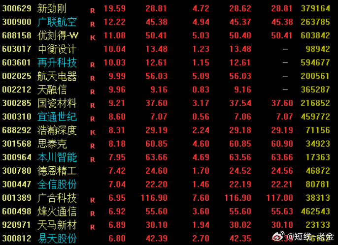 消息面上,由中国运载火箭技术研究院研制的长征八号甲遥八运载火箭,在海南商业航天发射场成功实施转运,火箭箭体被顺利运至发射区一号发射工位,计划近期择期发射。商业航天概念走强,航天电器、再升科技涨停,广联航空涨超11%,航天环宇、航天发展、中国卫星、雷科防务、上海瀚讯跟涨。胖东来12名店长共分2.4亿资产利润伊朗警告油价或超200美元