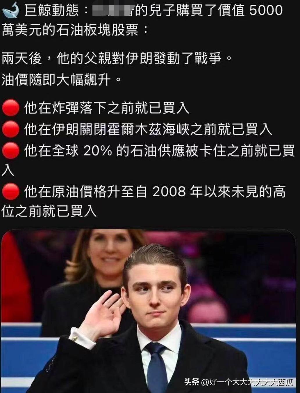 特朗普什么时候会喊停打击伊朗? 有聪明人已经想到了时间点, 就是在他儿子突然开始在石油期货市场上建仓做空的时候, 只要一旦空头建仓完成, 特朗普立马就会宣布美以大获全胜, 这么简单的道理很多期货玩家还没有看明白。