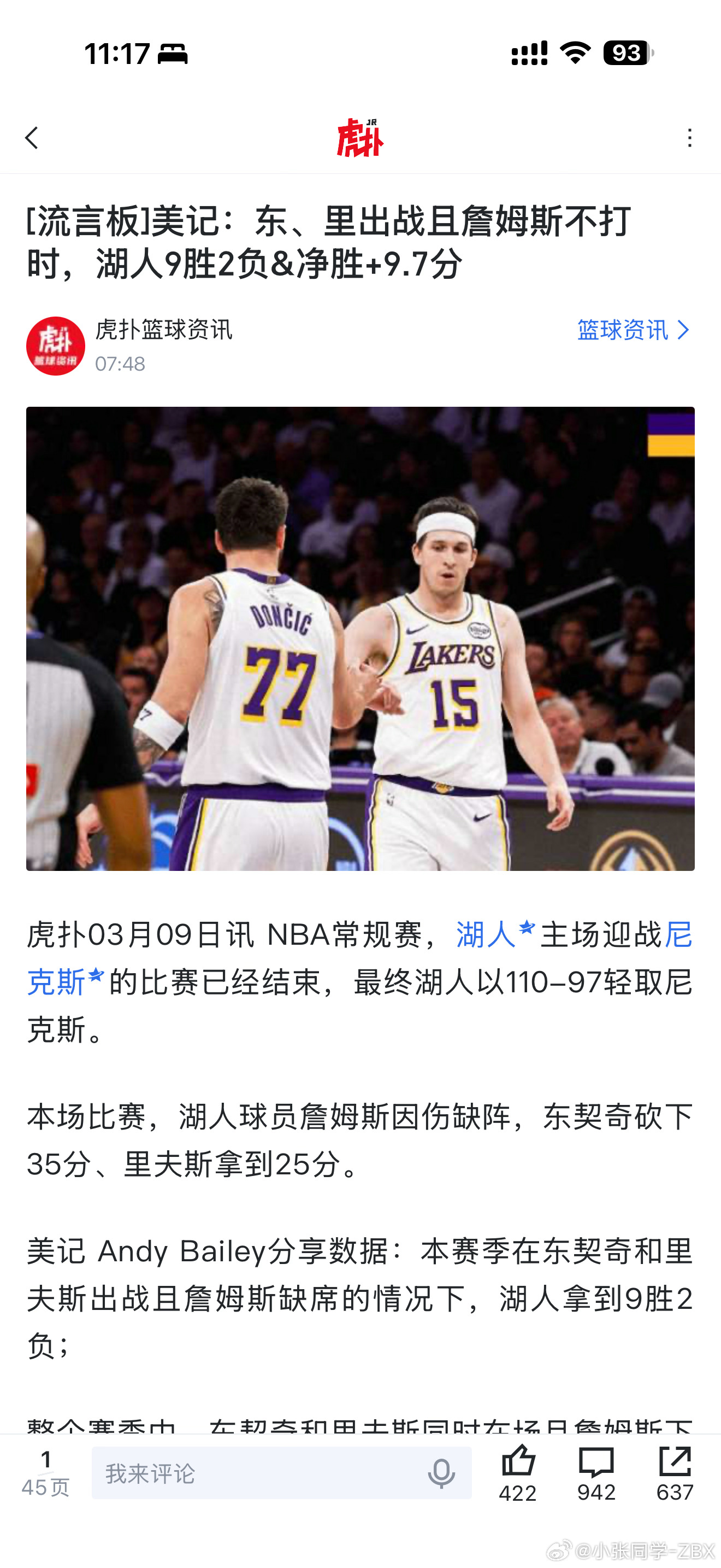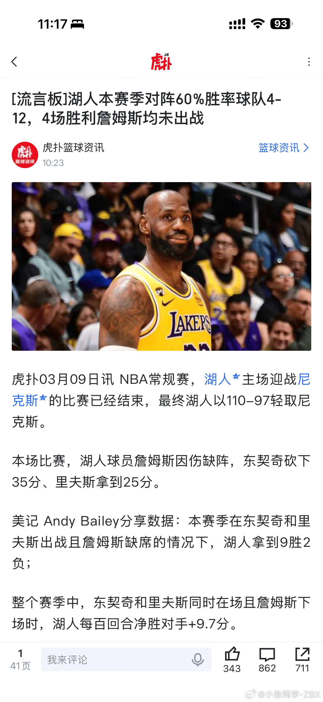 数据证明了没有詹姆斯的湖人是更强的球队,为什么詹密就不信呢?美职篮说车