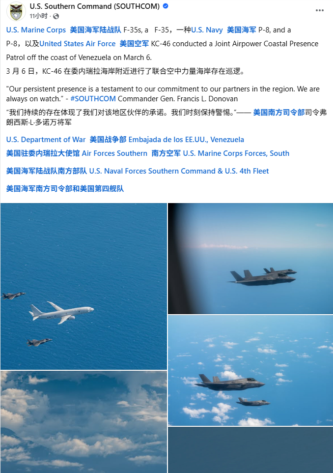 3月6日,MD四等人的F-35B战斗机、MD一等人的P-8反潜巡逻机和MD二等人的KC-46加油机在委内瑞拉沿海进行了联合空中力量海岸巡逻。【图2】可以看到委内瑞拉城市拉瓜伊拉(La Guaira),距离首都加拉加斯仅30公里。今日球电