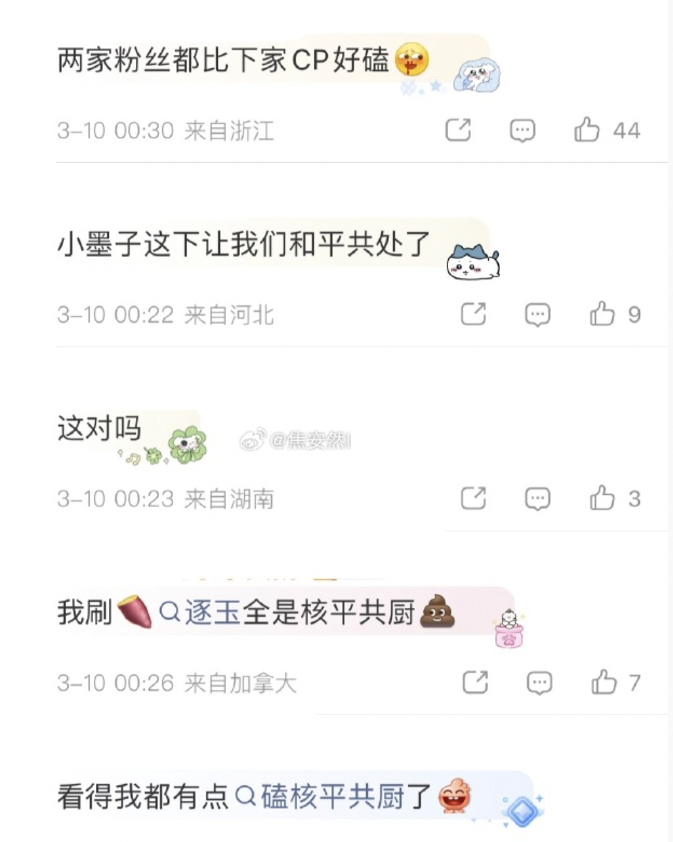 第一次见把俩主演唯粉虐成cp粉的,张凌赫田曦薇唯粉都有cp名了叫核平共厨。