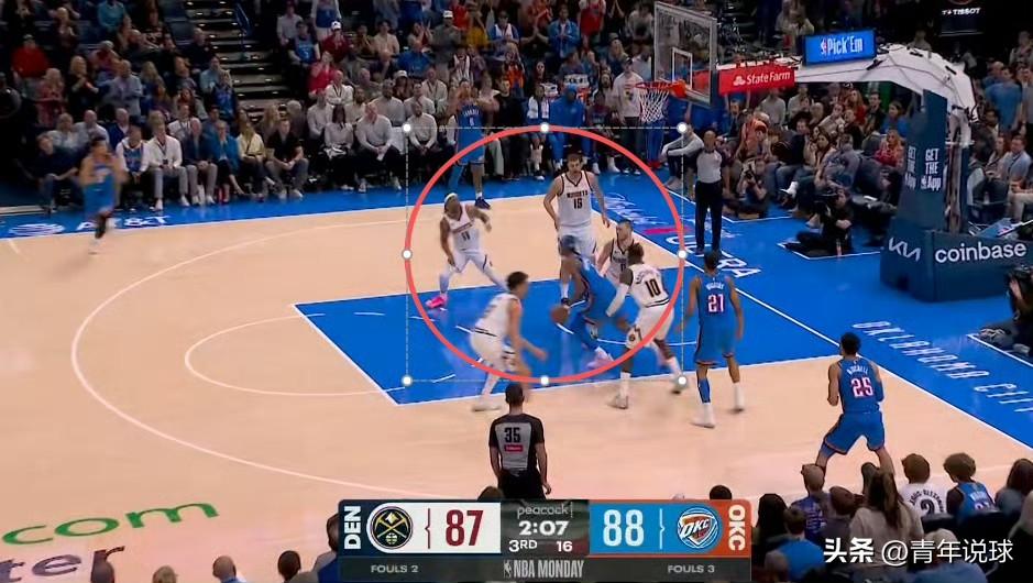 5人合围!亚历山大夸张的防守待遇! 今天,雷霆队坐镇主场迎战掘金队,两大MVP候选人亚历山大和约基奇再度迎来正面对决。比赛过程中发生了让人瞠目结舌的一幕,第三节最后2分07秒,亚历山大突破进入内线竟然吸引了掘金队场上全部5个人的防守注意力,后者5人全部收缩篮下来合围亚历山大,雷霆队外线全部是空位投篮机会,这样的防守待遇真的太离谱了,这足以证明亚历山大的能力有多么出众,不愧是本赛季MVP排行榜的最大热门!