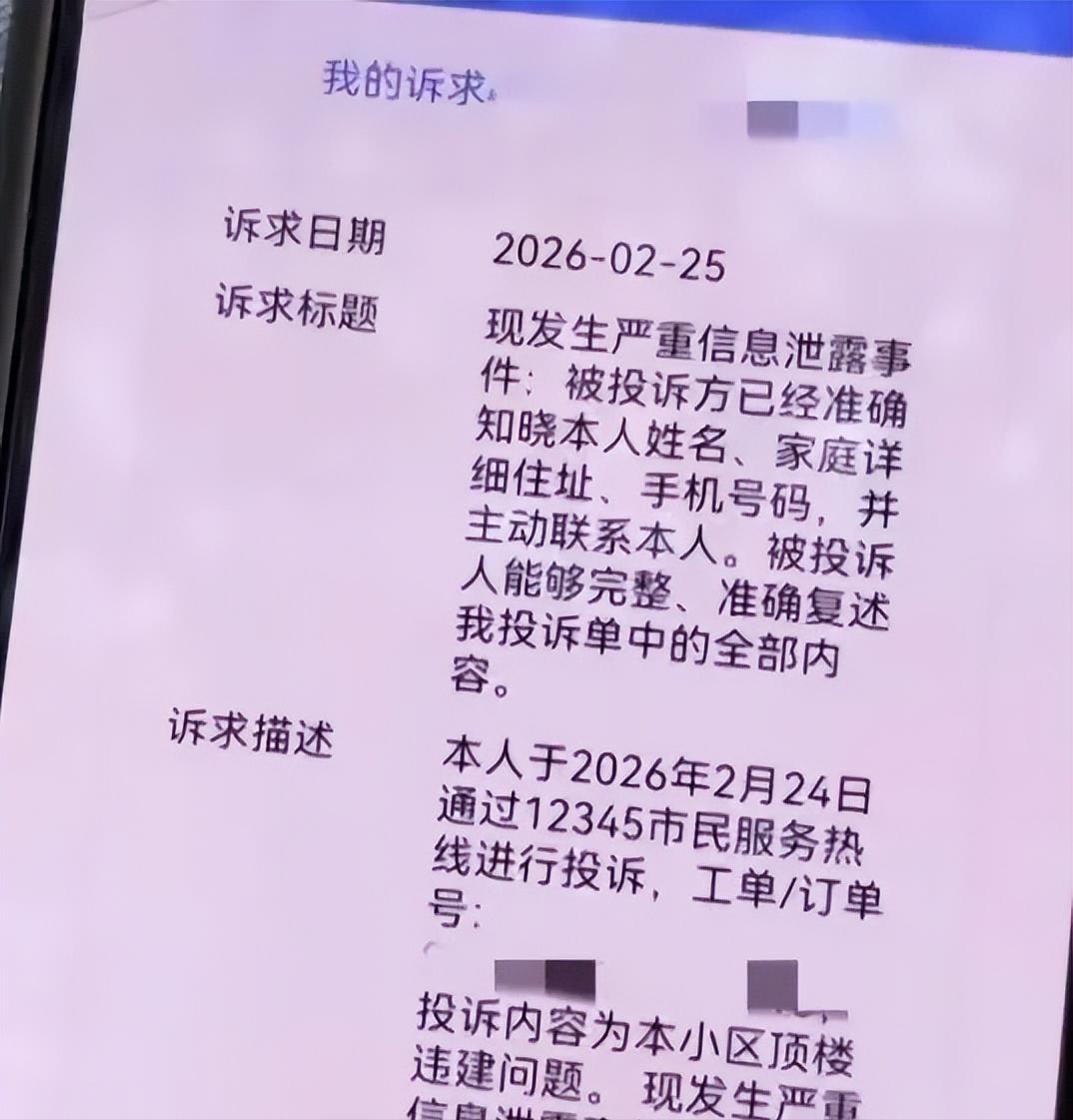上海,男子上班的时候,看到小区1栋楼的楼顶,盖了块黑布,就知道那里存在违法搭建行为,他就举报了,结果还没有等到任何人的回复,被举报人居然打来了电话,不但得到了男子的所有信息,甚至连男子妈妈在哪里打拳都了如指掌,她嚣张地说道:“你当天投诉,我10分钟后就知道了。”男子吓得赶紧报了警。 2月24日,他用手机在12345平台提交了实名投诉,姓名、电话、住址一项没落。 楼顶蒙着黑布的那栋楼就在小区23号,他每天开车进出都能看到。 其他楼顶干干净净,唯独那里遮得严实,他判断是在翻新存量违建。 投诉发出后,他本以为会等到工作人员联系核实。 第二天下午,陌生号码先找上门。 对方直接点出他的姓氏和住址,还把他填报的内容逐条复述。 语气带着压迫感,话里话外都在暗示她已经掌握了他和家人的生活轨迹。 母亲平时去哪里锻炼,他几点下班,这些细节都被提到。 两人此前没有任何往来。 挂断电话,他当晚就报了警。 派出所出面提醒那名女业主不要再骚扰。 违建随后被核查,属于旧有搭建翻修,最终自行拆除。 事情表面上似乎画上句号。 男子却开始担心另一件事。 自己从平台提交的信息,流转到哪个环节出现了漏洞。 他带着家人暂时搬离住所,连续两周没有回去。 城运中心表示,接收的工单只显示姓氏和联系电话。 城管部门称按流程核查现场,没有接触完整个人资料。 物业方面提到,被投诉的女业主曾做过小区志愿服务。 居委会则表示只配合现场查看,没有掌握投诉详情。 各方都否认外泄。 可对方不仅知道联系方式,还清楚楼栋单元。 男子再次通过平台反映信息安全问题,要求追查记录。 综合服务热线在处理投诉时,通常会生成工单并转派属地部门。 理论上应当对投诉人信息进行必要的隐藏,只保留处理所需内容。 若脱敏不到位,或者有人私下查看截图,隐私就可能外流。 个人信息保护法明确,姓名、住址、联系方式都属于受保护范围。 非法获取、传播都会承担责任。 男子只是普通业主,路过发现异常情况后选择反映。 他没有与任何人发生争执。 从提交到被找上门,中间的时间很短。 这种经历让他意识到,问题不只在邻里纠纷,而在信息管理。 目前相关部门表示会进一步核查流转节点。 男子在等待结果,也在考虑是否搬离。 楼顶的黑布已经撤下。 生活秩序能否恢复,还要看信息泄露的源头能否查清。 对他而言,违建整改只是起点,隐私安全才是更重要的答案。