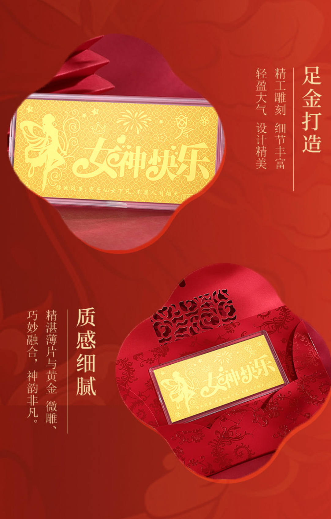 它不仅是一件黄金饰品,更是一份专属祝福 —— 致敬每一位闪闪发光的女性,愿你心中有光,眼里有笑,生活有甜,人生有金,女神常在,快乐常在!