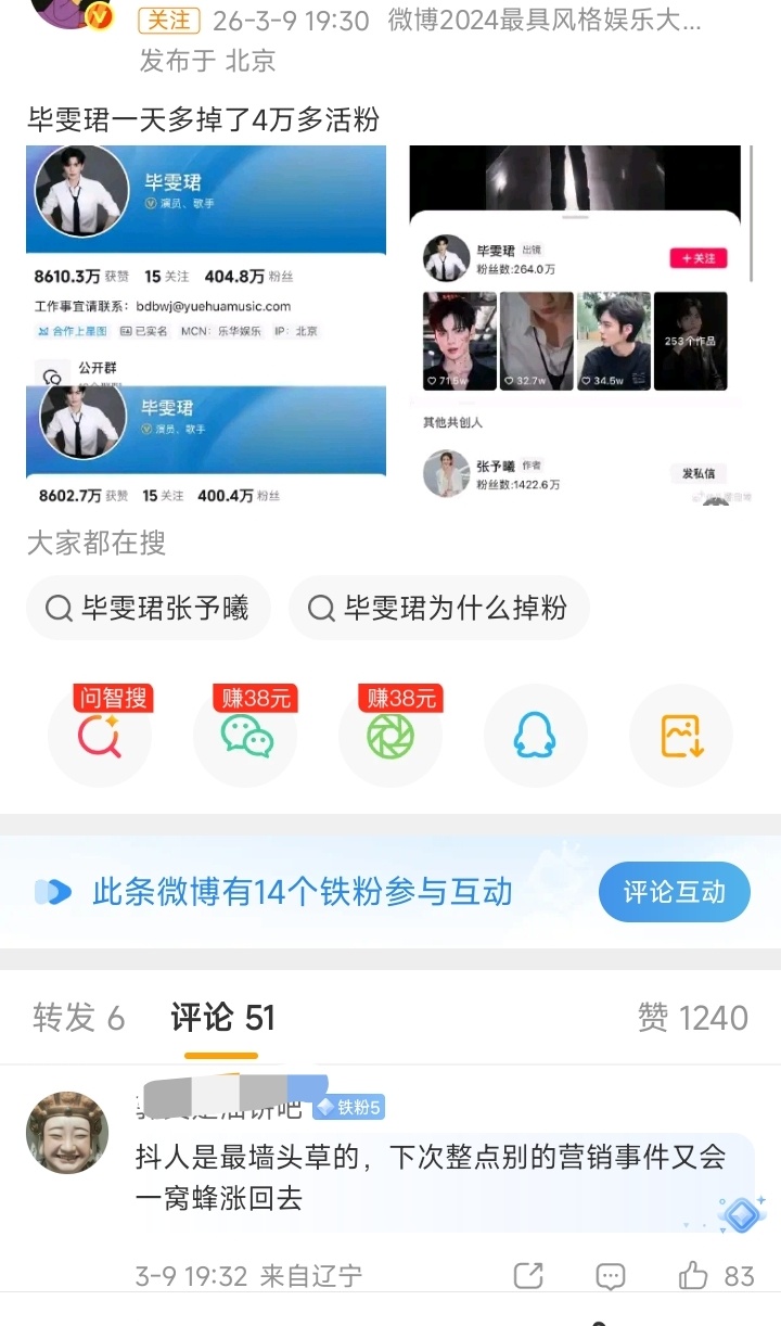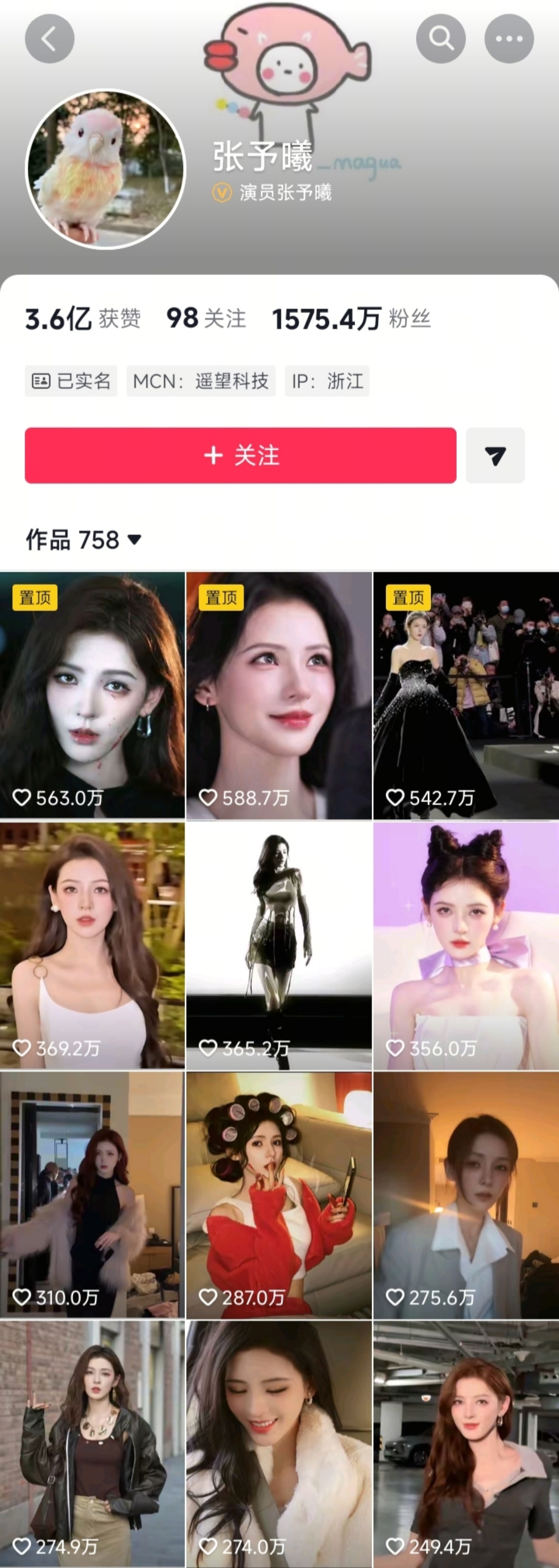 cp粉说毕雯珺一天掉了4万粉。以前的高赞也是和张予曦相关的,就这样男方还先解绑……