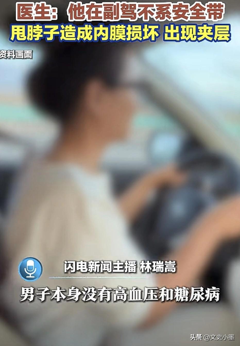 近日,一30多岁男子在陪新手妻子练车时,由于其妻子对车辆操作不太熟,导致在路上频繁急踩刹车,而坐在副驾驶的男子因为没有系安全带,在惯性作用下身体前后多次摆动! 行驶一段时间后,男子感觉不太舒服要求妻子停车,后来被紧急送医院检查,经医生诊断后确诊为脑梗,原因是他在副驾驶没系安全带,妻子每次急踩刹车后,他的脖子就会甩一下,次数多了导致其血管内膜损坏,最终出现夹层继发脑梗! 该男子仅30多岁,平时身体比较健康,没有高血压,糖尿病等基础病,出现脑梗纯属碰巧了吧!加上妻子开车操作不当,可能会让坐在副驾驶的他心里着急,多重因素共同造成了这个结果吧!