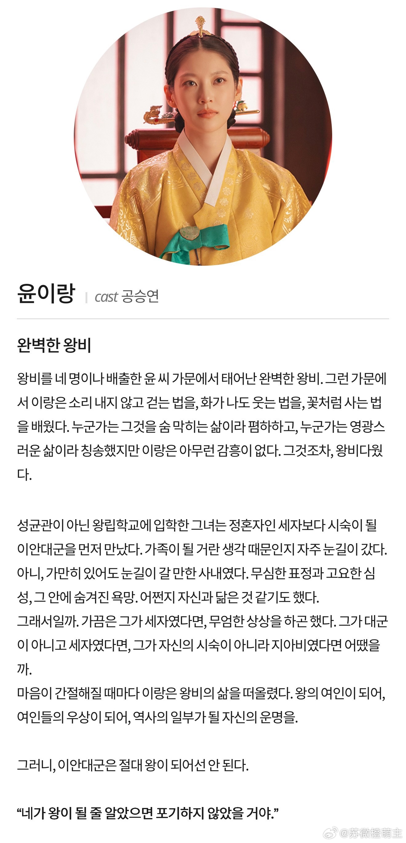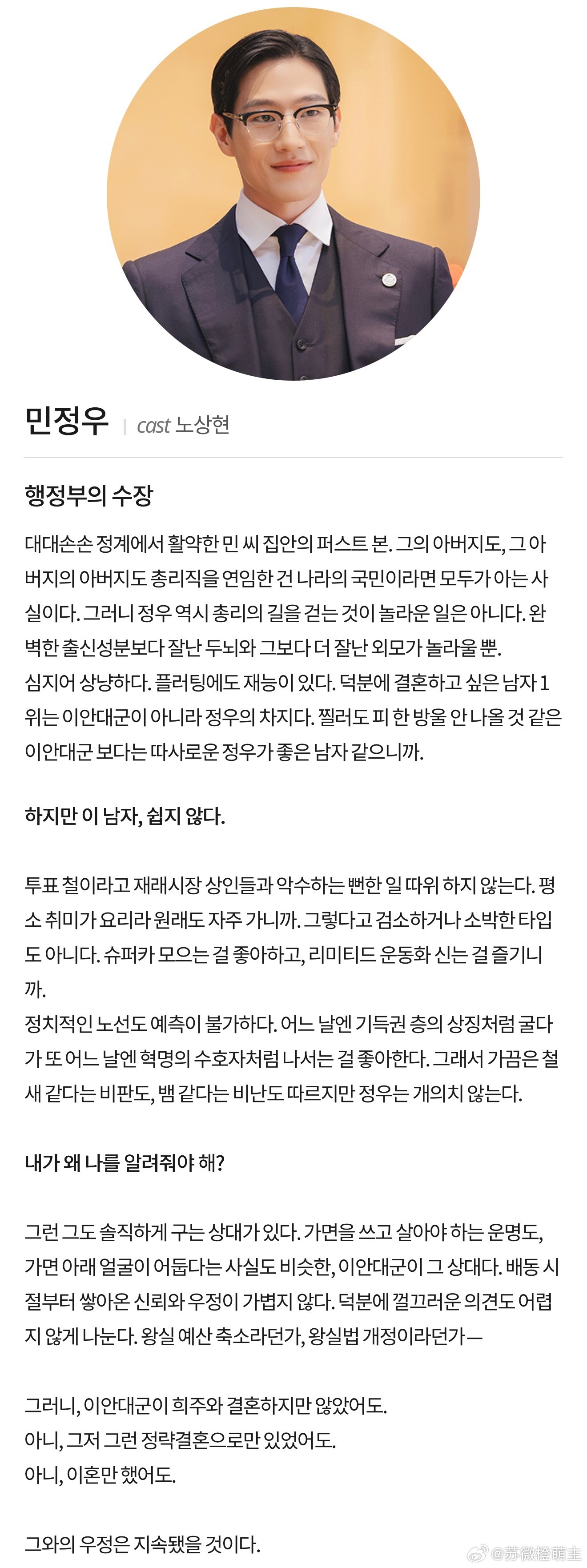 21世纪大君夫人 21世纪大君夫人人物介绍闵正宇行政部首长世代在政界活跃的闵氏家族中的佼佼者。他的父亲,以及他父亲的父亲都曾连任总理,这是全国国民皆知的事实。因此,正宇走上总理之路也并非什么令人惊讶的事。比起他完美的出身,更令人惊叹的是他那出众的头脑和比头脑更为出众的外貌。他甚至很温柔。也很有调情的才华。正因如此,“最想嫁的男人”第一位不是李安大君,而是正宇的囊中之物。比起那种戳一下恐怕连一滴血都不会流的李安大君,还是温暖的正宇看起来更像个好男人。但是,这个男人,并不简单。他不会在选举季去做诸如和传统市场商人们握手之类的“苦差事”。因为他平时爱好就是烹饪,所以本来就常去市场。但他也并非节俭或朴素的类型。他喜欢收集超级跑车,享受穿着限量版运动鞋的乐趣。其政治路线也难以预测。有时是既得权层象征的“保守派”,有时又像革命的守护者一样站出来说“这也不行那也不行”。因此,偶尔也会伴随着“像候鸟一样(摇摆不定)”的批评和“像蛇一样(善变)”的指责,但正宇并不在意。我为什么要向别人说明我自己?这样的他,也有一个能坦诚相对的对手。那就是李安大君——一个和他同样有着必须戴着面具生活的命运、以及面具下的脸庞同样晦暗的人。从年幼时开始积累的信任与友谊并不轻浅。因此,即使交换尖锐的意见也并不困难。比如缩减王室预算,修订王室法。所以,如果李安大君没有和熙珠结婚的话。不,即使只是那种政治联姻,只要维持着名义上的婚姻。不,哪怕只是离婚了也好。那么,与他的友谊本可以持续下去的。尹伊朗完美的王妃出生于已培养出四位王妃的尹氏家族的完美王妃。在这样一个家族里,伊朗学会了无声走路的方法,学会了生气也要微笑的方法,学会了如花朵般生存的方法。有人贬低那是令人窒息的生活,也有人称赞那是光荣的生活,但伊朗内心毫无波澜。即便是这点,也很有王妃的风范。她入学的不是成均馆,而是王立学校。在那里,她先遇到的不是她的未婚夫世子,而是将成为她小叔子的李安大君。或许是因为想着会成为一家人,目光总是不自觉地追随他。不,即使他静静待着,也是个足以吸引目光的男人。无心的表情、寂静的性情,以及那之中隐藏的欲望。总觉得似乎和自己有些相似。或许是因为这个缘故吧,偶尔会做做不切实际的想象:如果他是世子的话……如果他是世子而不是大君,如果他是自己的丈夫而不是小叔子的话,会怎么样呢。每当心意变得恳切时,伊朗便会想起自己作为王妃的人生。想起自己将成为君王的女人、成为女人们的偶像、成为历史一部分的命运。所以,李安大君绝对不可以成为王。“如果早知道你会成为王,我就不会放弃了。”