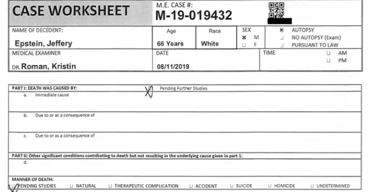巴登在最终检查了杰弗里·爱泼斯坦的尸体后,认为爱泼斯坦脖子上的绳索和骨折的分布情况更符合他杀的特征,而不是用床单上吊自杀。罗曼在爱泼斯坦的死亡证明上,没有勾选“他杀”或“自杀”的选项,而是勾选了“待调查”选项。