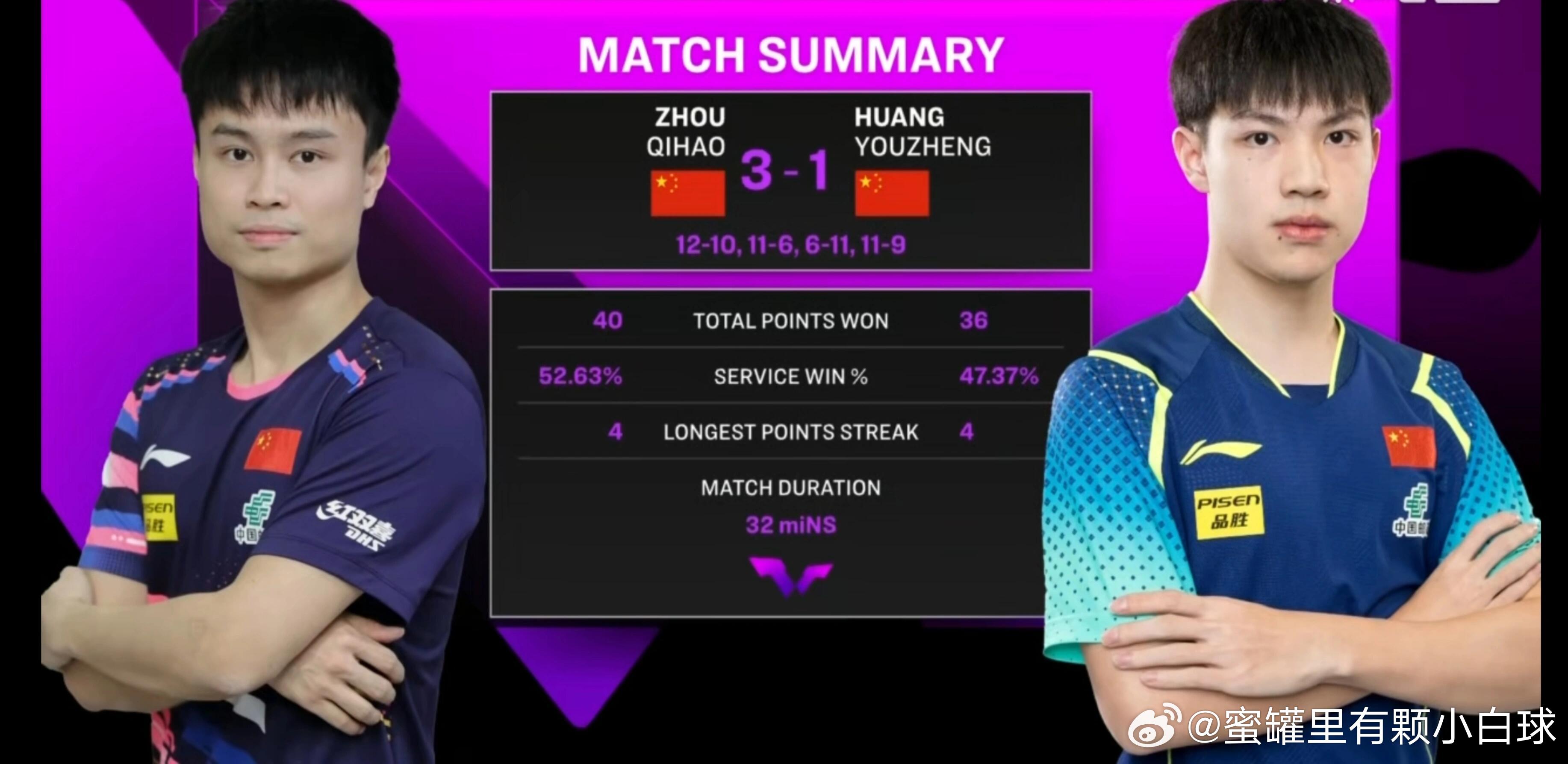 周启豪3比1黄友政WTT重庆冠军赛男单首轮:周启豪3:1黄友政第一局两人就杀得难解难分,周启豪12-10艰难拿下。第二局七号乘胜追击,11-6再下一城。第三局黄油直接6-11扳回。第四局更是神仙打架,黄友政一度领先,但七号经验还是老道啊,关键分稳得住,11-9带走比赛!恭喜周启豪晋级,也把掌声送给黄友政,敢打敢拼,未来可期!两位都辛苦了,继续加油周启豪晋级重庆冠军赛16强黄友政止步重庆赛首轮