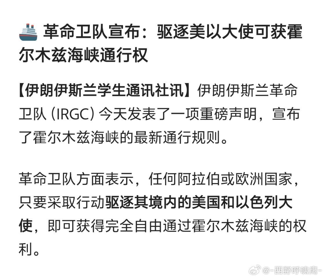 伊朗称驱逐美以大使可过霍尔木兹可以的,就是要这样跟纸老虎硬碰硬
