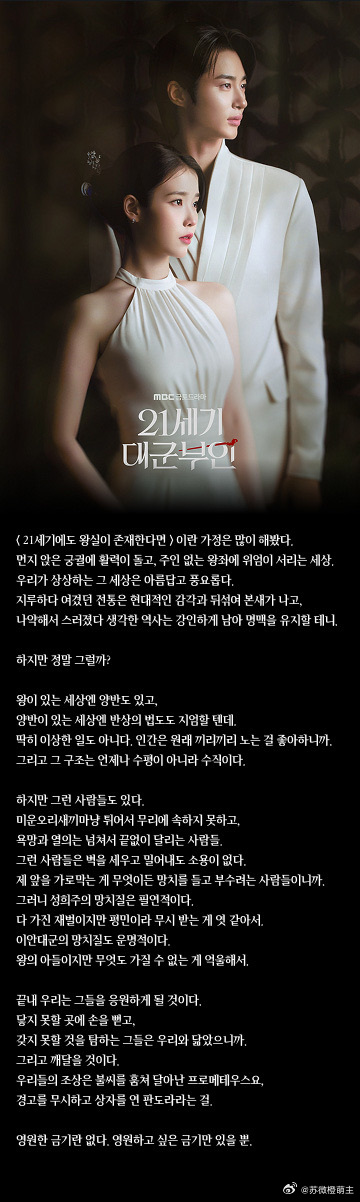 21世纪大君夫人 21世纪大君夫人 内容企划如果到了21世纪王室依然存在的话在尘封的宫殿里重新注入活力,在空无一人的王座上重新凝结威严的世界。我们想象的那个世界美丽而富饶。曾觉得乏味的传统与现代感觉相互融合,焕发出新的面貌,曾认为软弱而消散的历史将顽强地留存,维持命脉。但,果真如此吗?有王的世界就会有贵族,有贵族的世界,就必然会恪守严苛的尊卑法度。这也不是什么奇怪的事。人类本来就喜欢同类相聚,而且那种结构从来就不是水平的,而是垂直的。但是,也有那样的人。像丑小鸭一样笨拙,无法融入群体,欲望与干劲十足,因而永不停歇奔跑的人。对那样的人,筑起高墙、加以阻拦都是没有用的。因为他们是那种,无论面前挡着什么,都会举起锤子将其砸碎的人。所以,成熙珠的挥锤是必然的。她虽拥有一切的财阀,却因为是平民而受歧视,这让她心有不甘。李安大君的挥锤也是命中注定的。他虽是国王的儿子,却因什么都无法拥有而感到委屈。最终,我们将会为他们应援。因为他们向着无法触及之处伸手,渴求着无法得到之物,这正与我们相似。并且终将领悟:我们的祖先是盗取火种逃走的普罗米修斯,也是无视警告打开盒子的潘多拉。没有永恒的禁忌,只有想要成为永恒的禁忌。