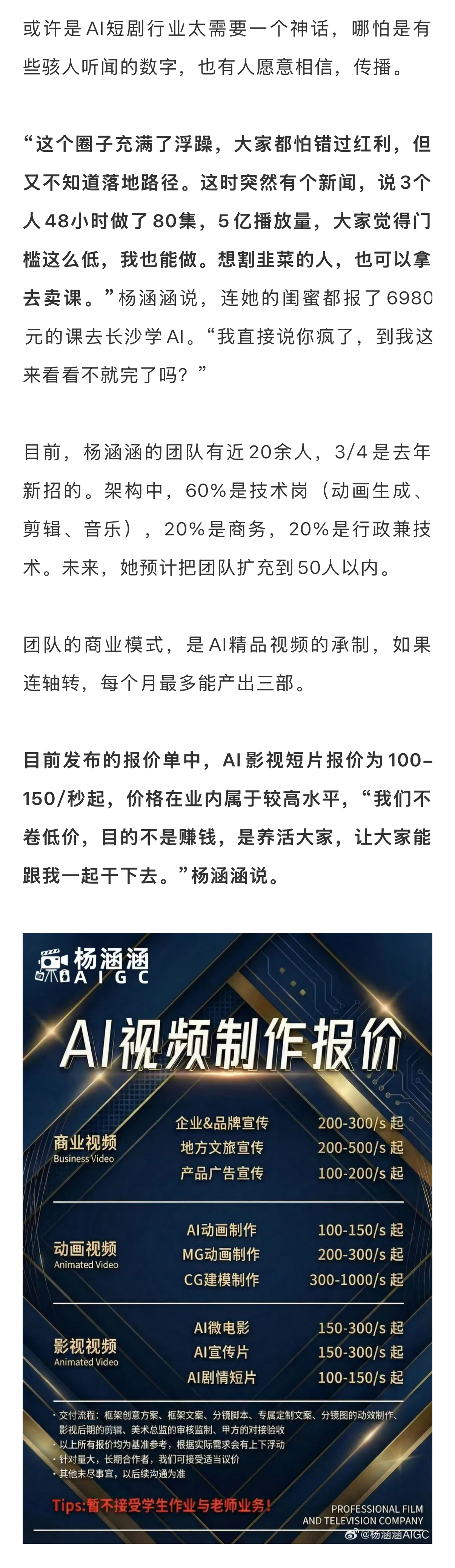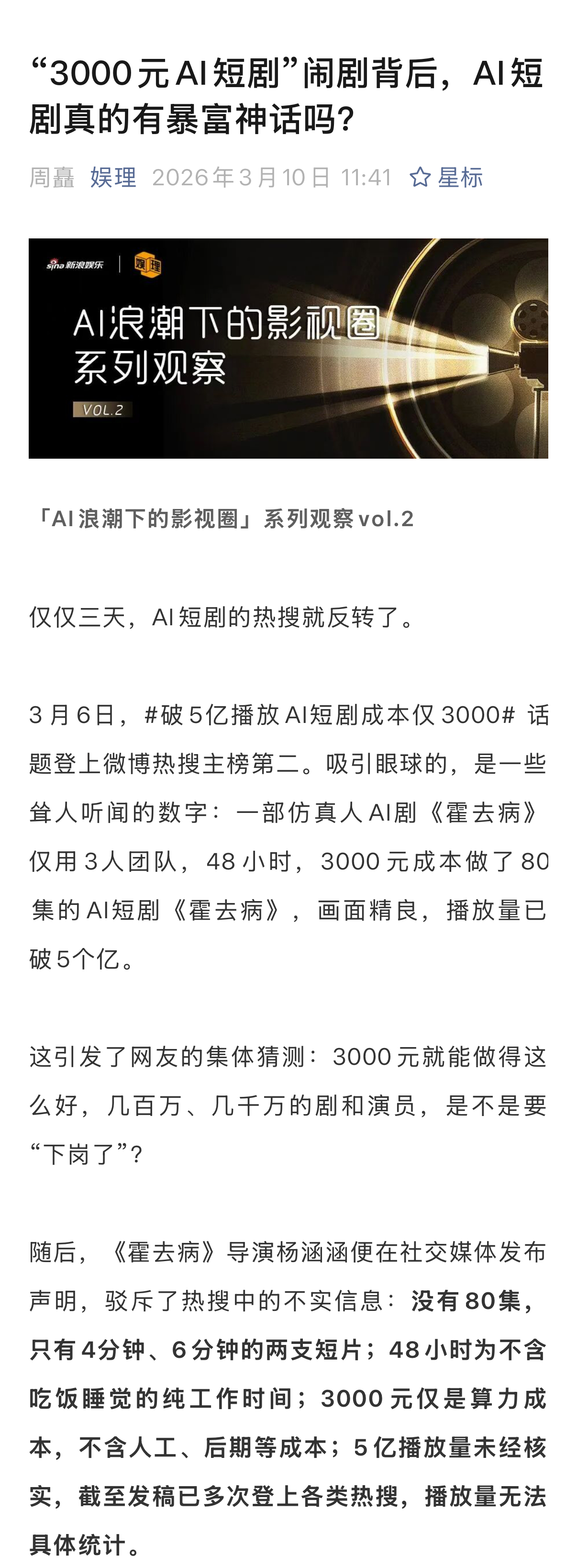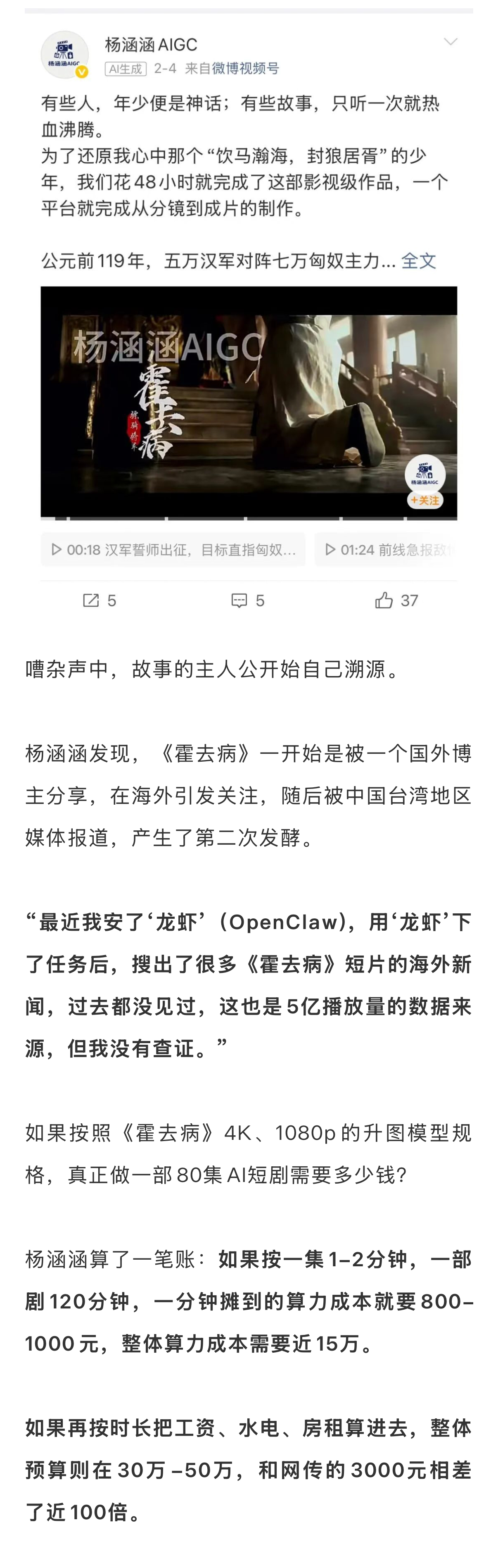 随后,《霍去病》导演杨涵涵便在社交媒体发布声明,驳斥不实信息:没有80集,只有4分钟、6分钟的两支短片;48小时为不含吃饭睡觉的纯工作时间;3000元仅是算力成本,不含人工、后期等成本;5亿播放量未经核实,截至发稿已多次登上各类热搜,播放量无法具体统计。